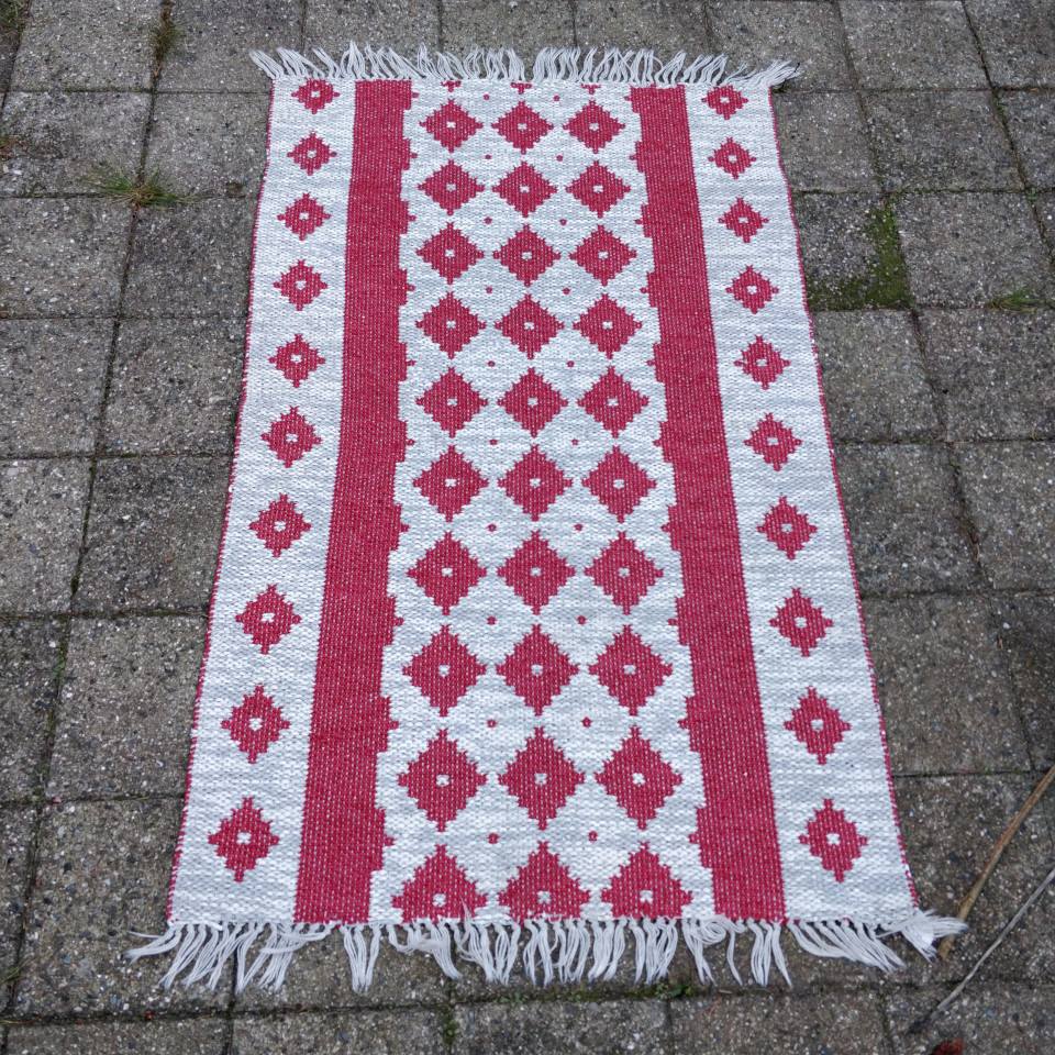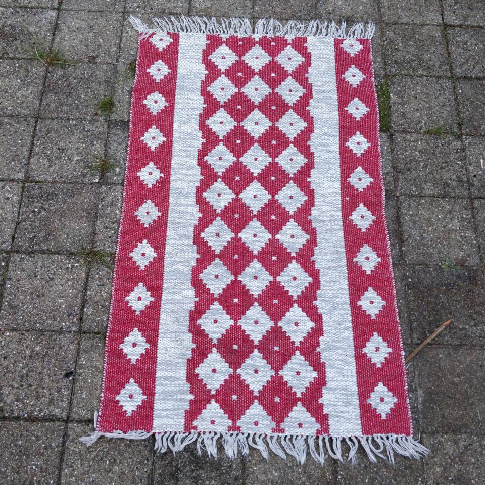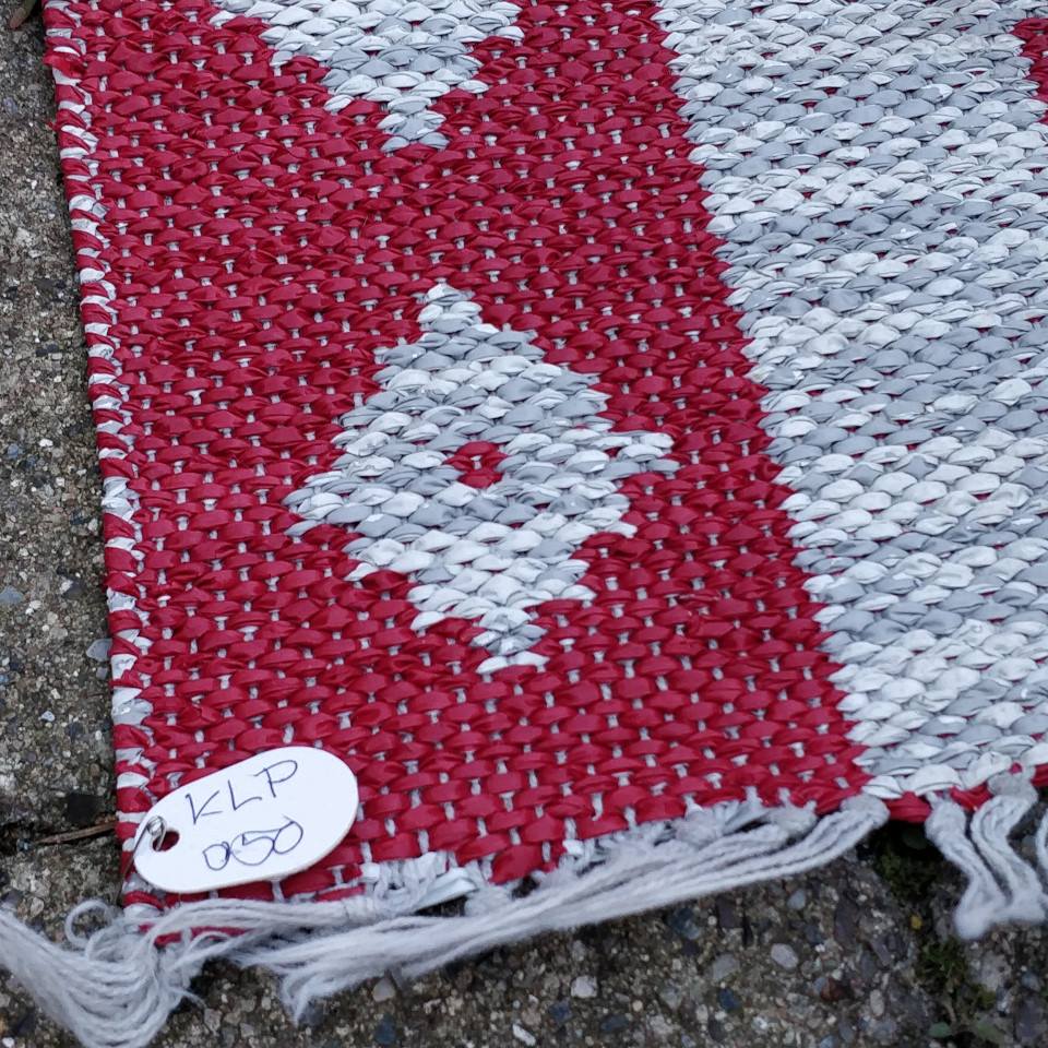 Mønstret plastik tæppe, i rød og grå.