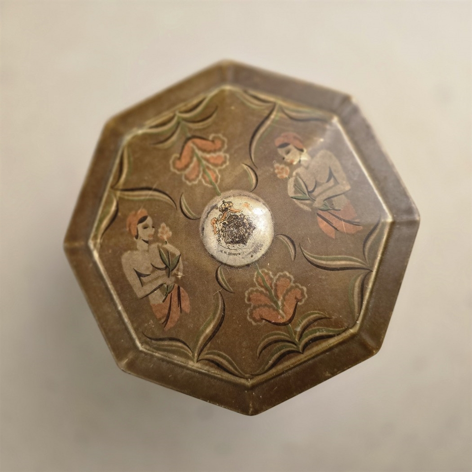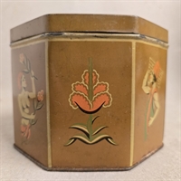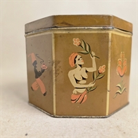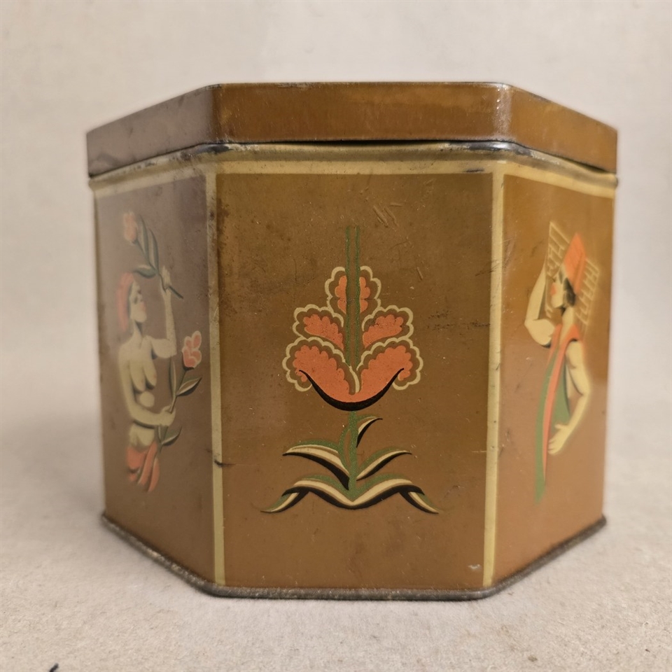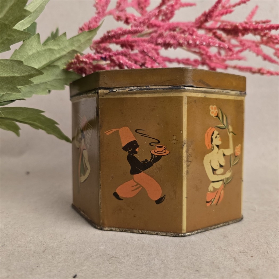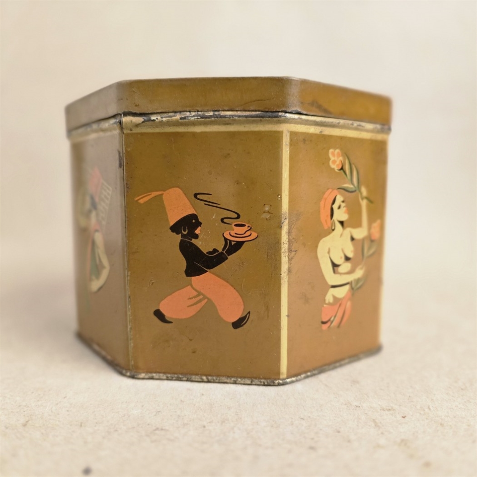 Denne særlige kaffedåse stammer fra Malmö og bærer præg af tidens tand, hvilket giver den en autentisk vintage følelse, der er svær at finde i nyere genstande.