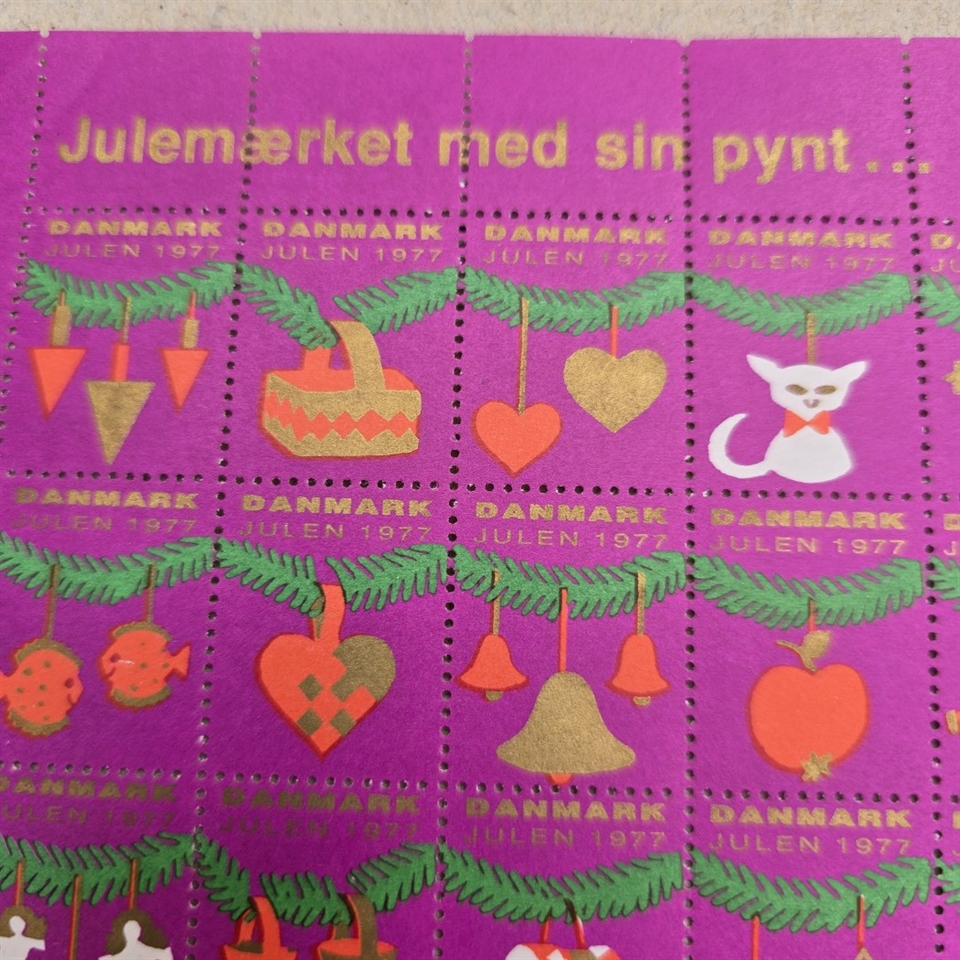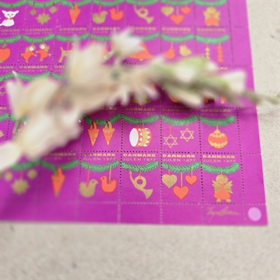 Perfekt for samlere eller som en særlig gave, dette ark med julemærker fra 1977 er ikke blot en fejring af året, men også en hyldest til den tidløse skønhed og tradition af dansk julepynt.
