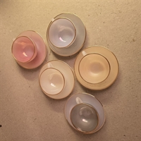 Giv dit kaffebord et strejf af vintage charme med disse betagende Arcopal pastelfarvede glaskopper fra 1960'erne. Dette sæt består af 5 elegante kopper, perfekt til både mokka og små kaffeportioner. Fremstillet af det anerkendte franske mærke Arcopal, er hver kop designet i en smuk pastelfarve, der tilføjer et nostalgisk og stilfuldt element til din borddækning.