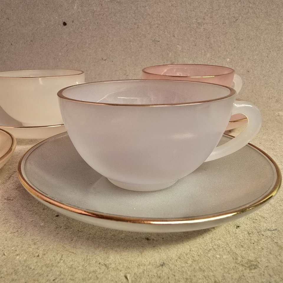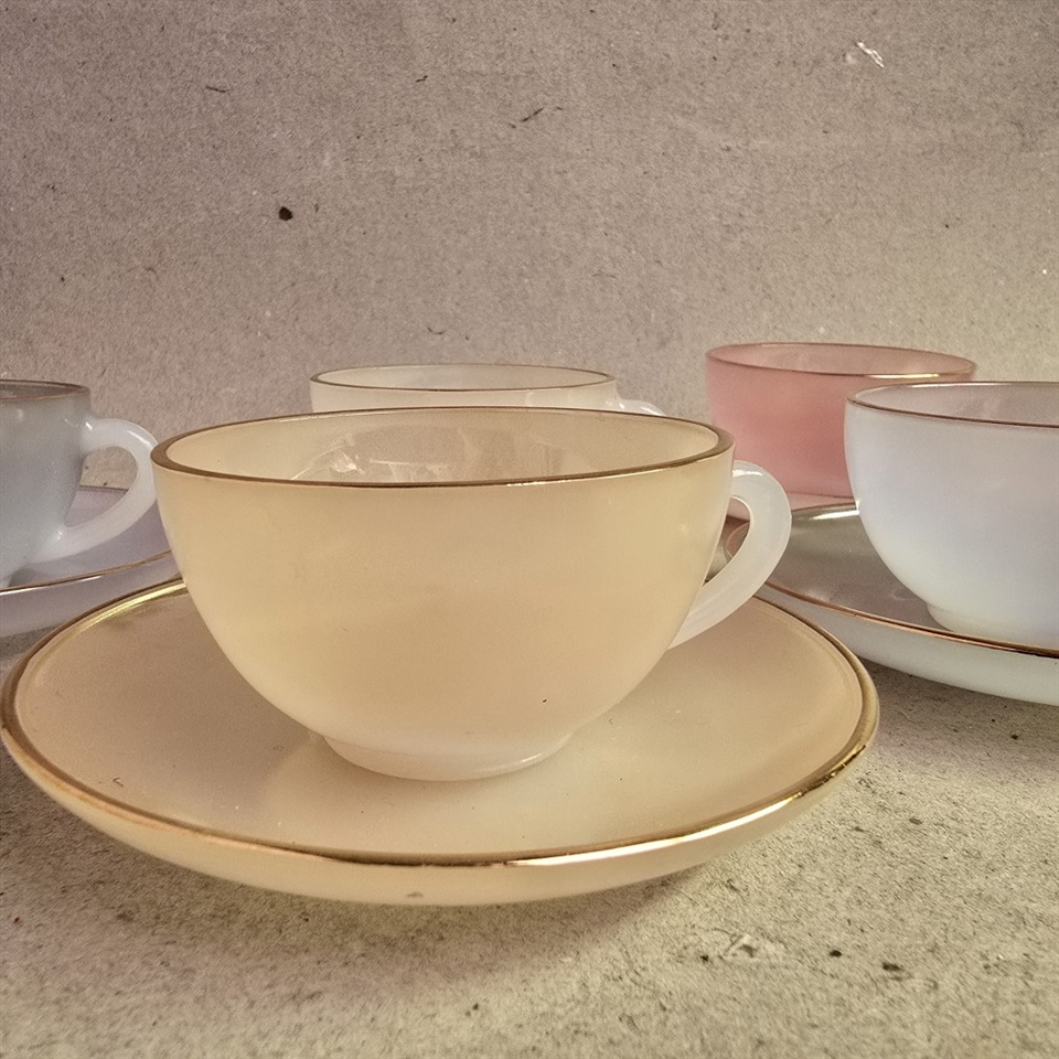 Nyd din morgenkaffe eller eftermiddagspause med et sæt kopper, der bringer historiens charme ind i dit hjem. Disse Arcopal pastelfarvede glaskopper er en sand skat fra 1960'erne, der lover at bringe både stil og funktion til dit bord.
