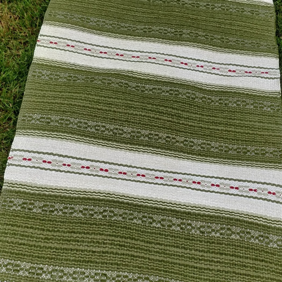 Denne unikke løber er fremstillet med et iøjnefaldende army-hvidt stribet mønster, der tilføjer en retro flair til enhver indretning.