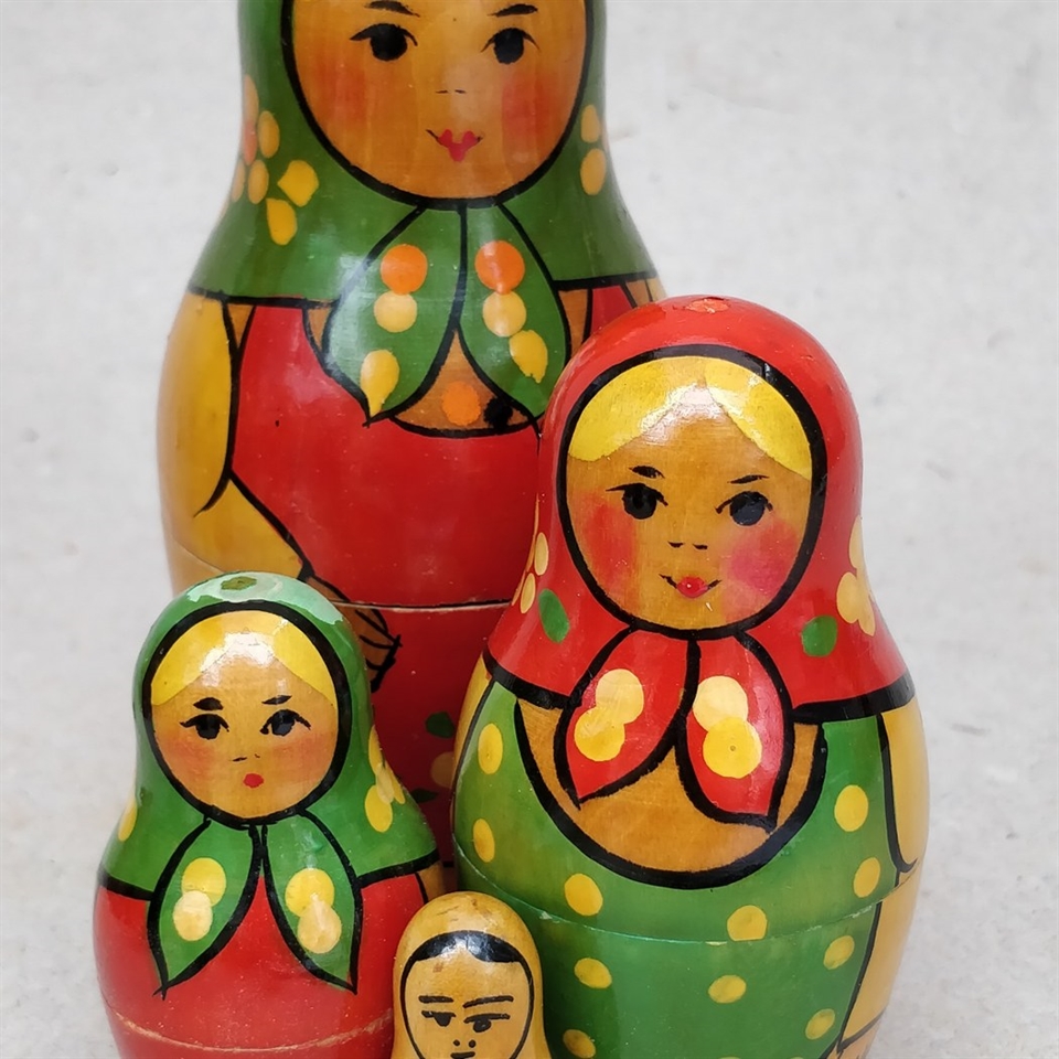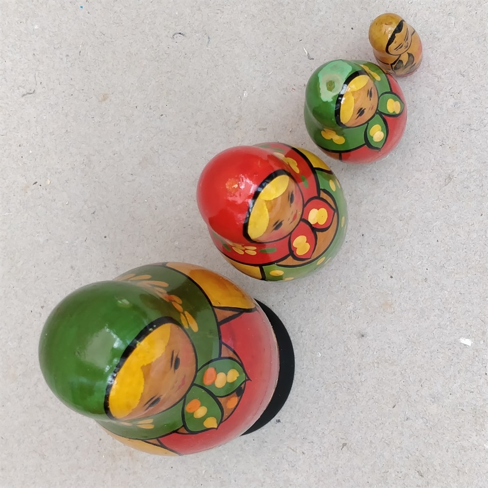 Hver dukke er omhyggeligt udskåret og passer indeni hinanden, hvilket demonstrerer både kunstnerisk finesse og traditionelt håndværk.