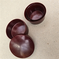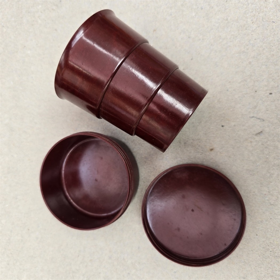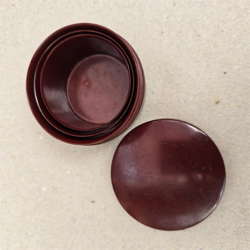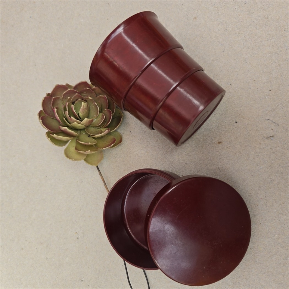 Når det ikke er i brug, kan kruset nemt klappes sammen og opbevares i den medfølgende, stilfulde runde æske, som også er fremstillet af bakkelit. Denne æske beskytter ikke kun kruset, men tilføjer også et strejf af vintage elegance til din samling.