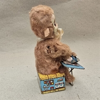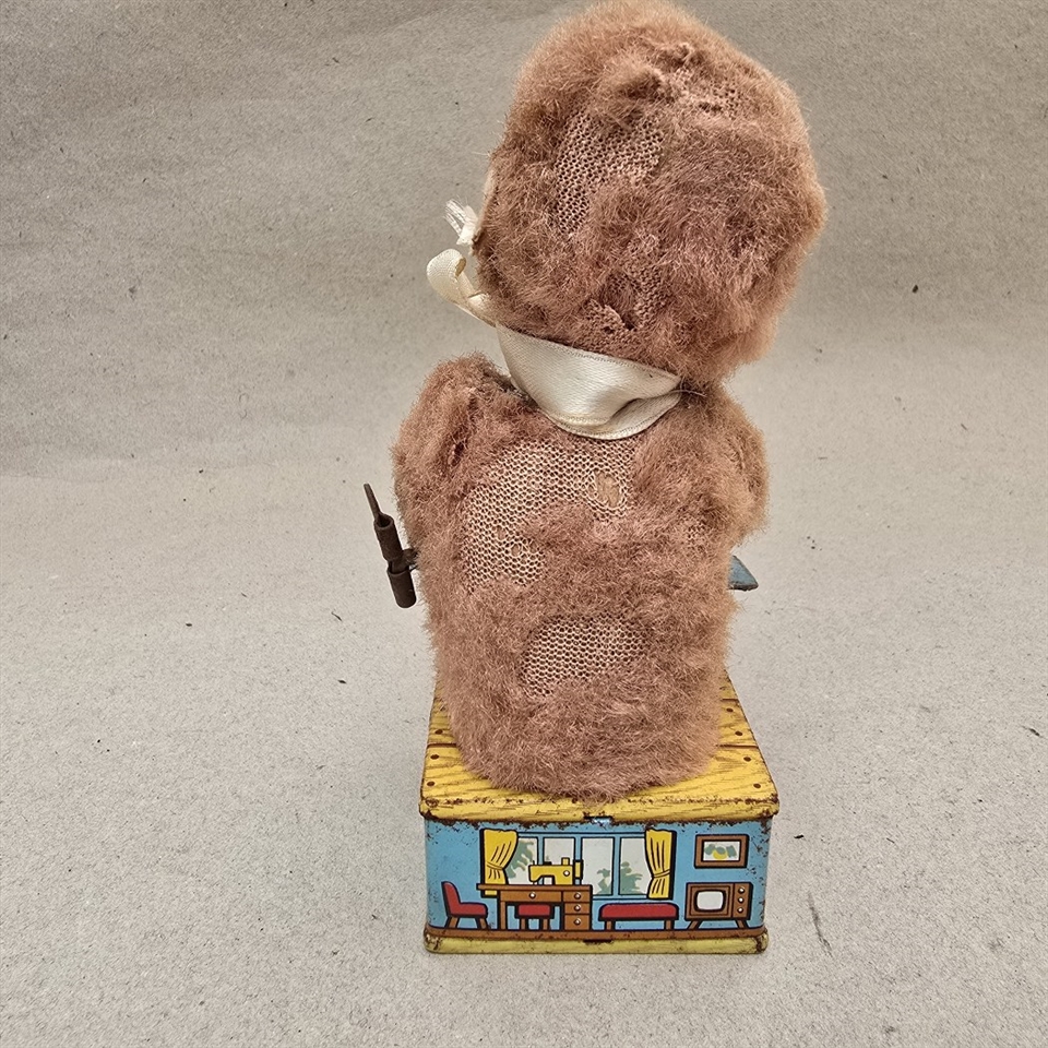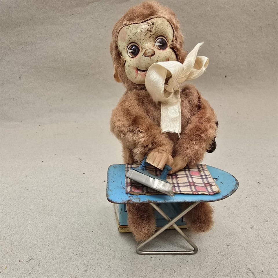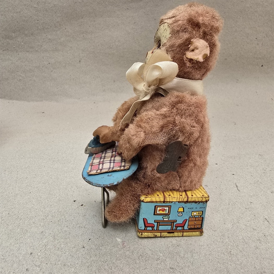 Denne charmerende teddybjørn er ikke bare en plysfigur; den er en kunstnerisk fremstilling af en bamse i fuld gang med en meget menneskelig aktivitet, nemlig at stryge tøj.