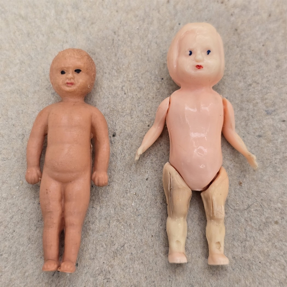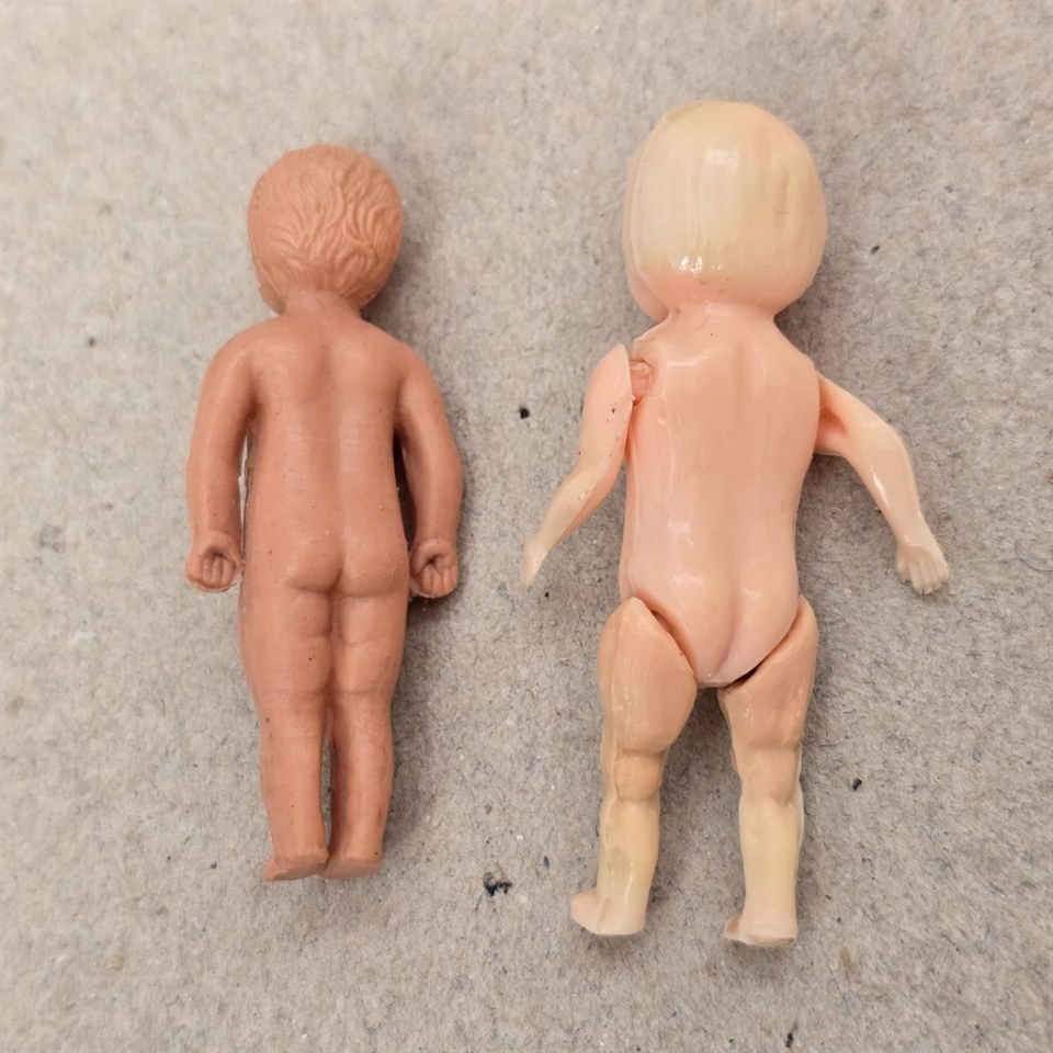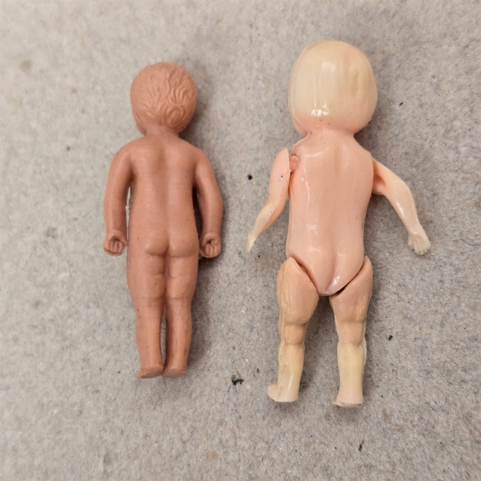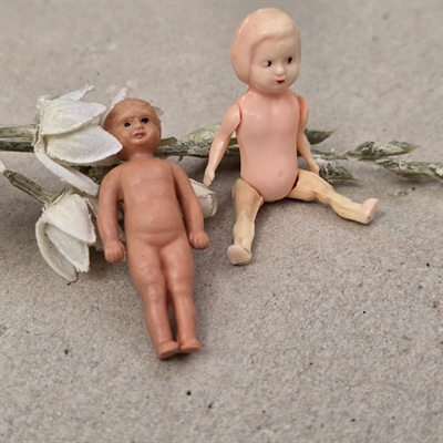 Den anden dukke i sættet komplementerer den første med sine bevægelige arme og ben, hvilket tilføjer et element af liv og dynamik til duoen. Dens lysere farvetone skaber en delikat kontrast, der er både tiltalende og harmonisk.