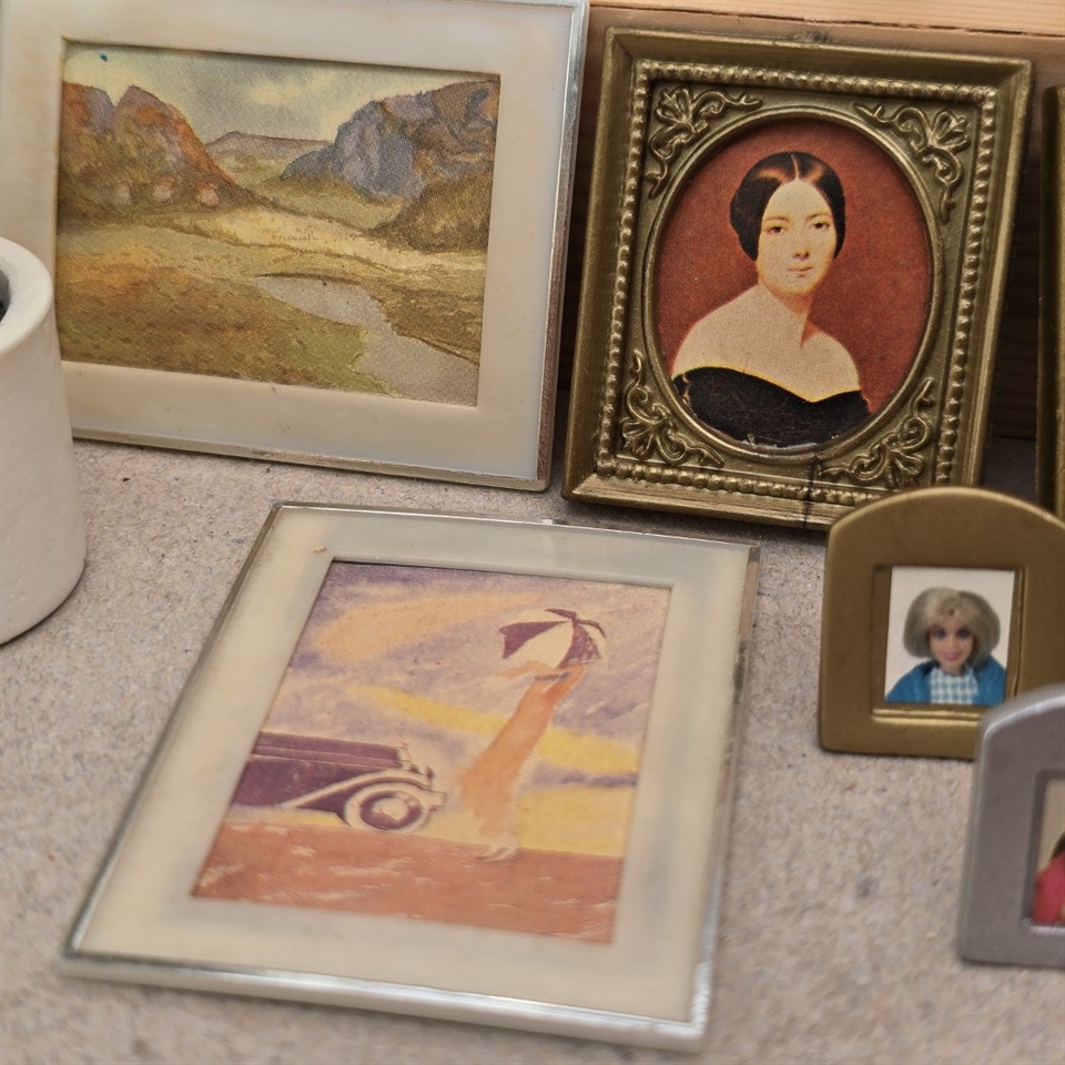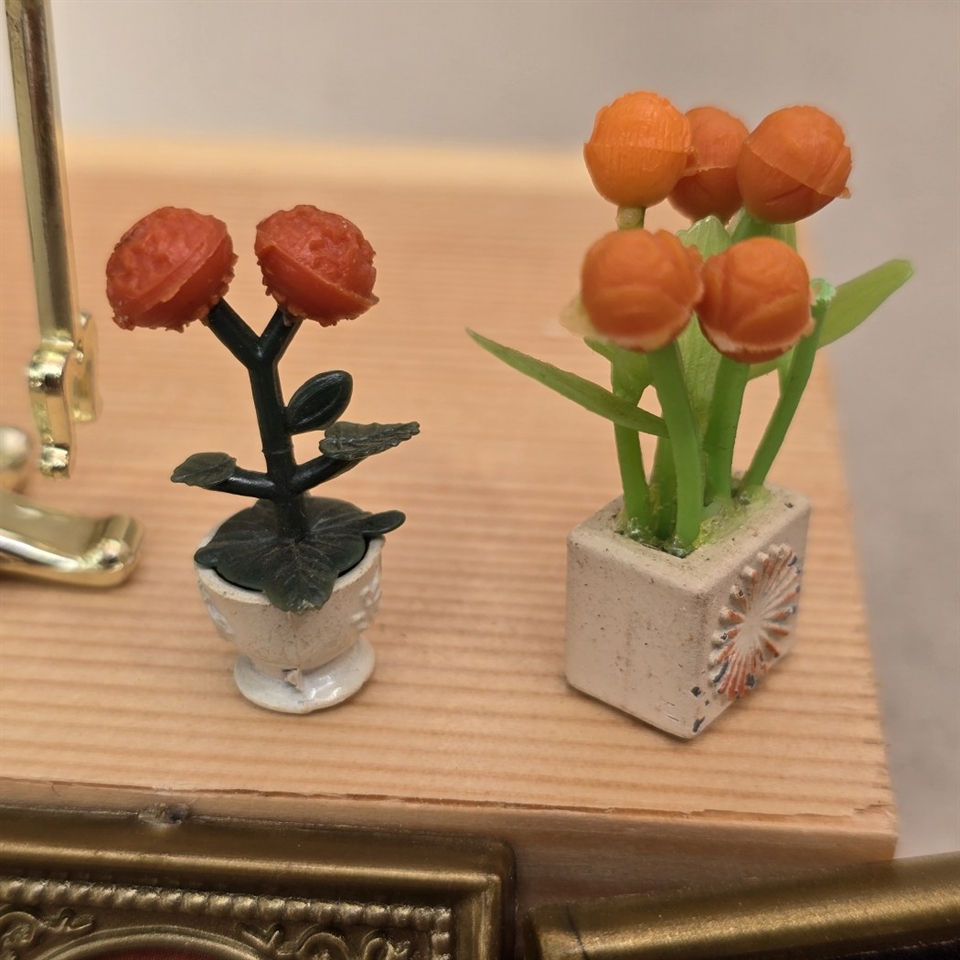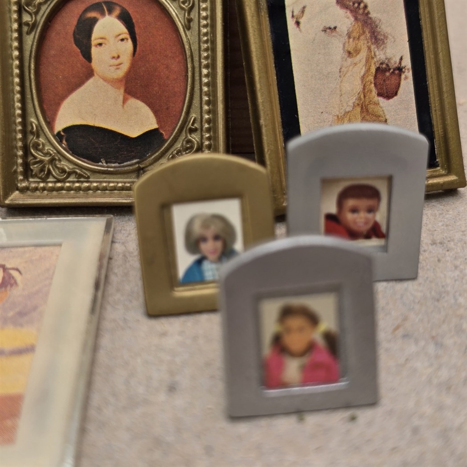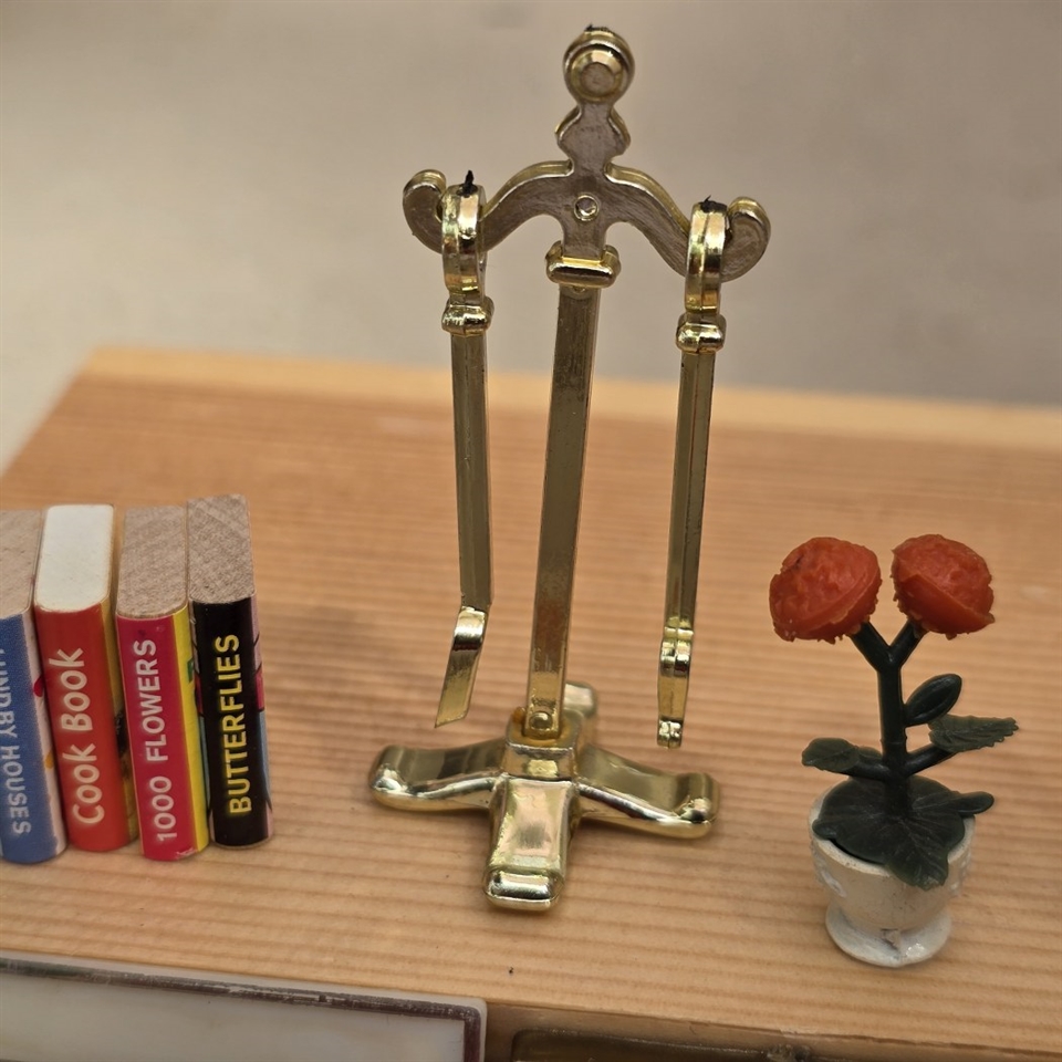 Opgrader din dukkestue med dette charmerende sæt af miniature billeder, bøger, et messingfarvet pejsesæt, og livagtige blomster – alle fremstillet med en øje for detalje og en kærlighed til genbrug!
