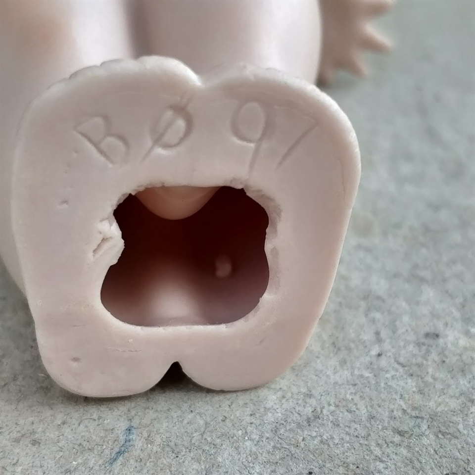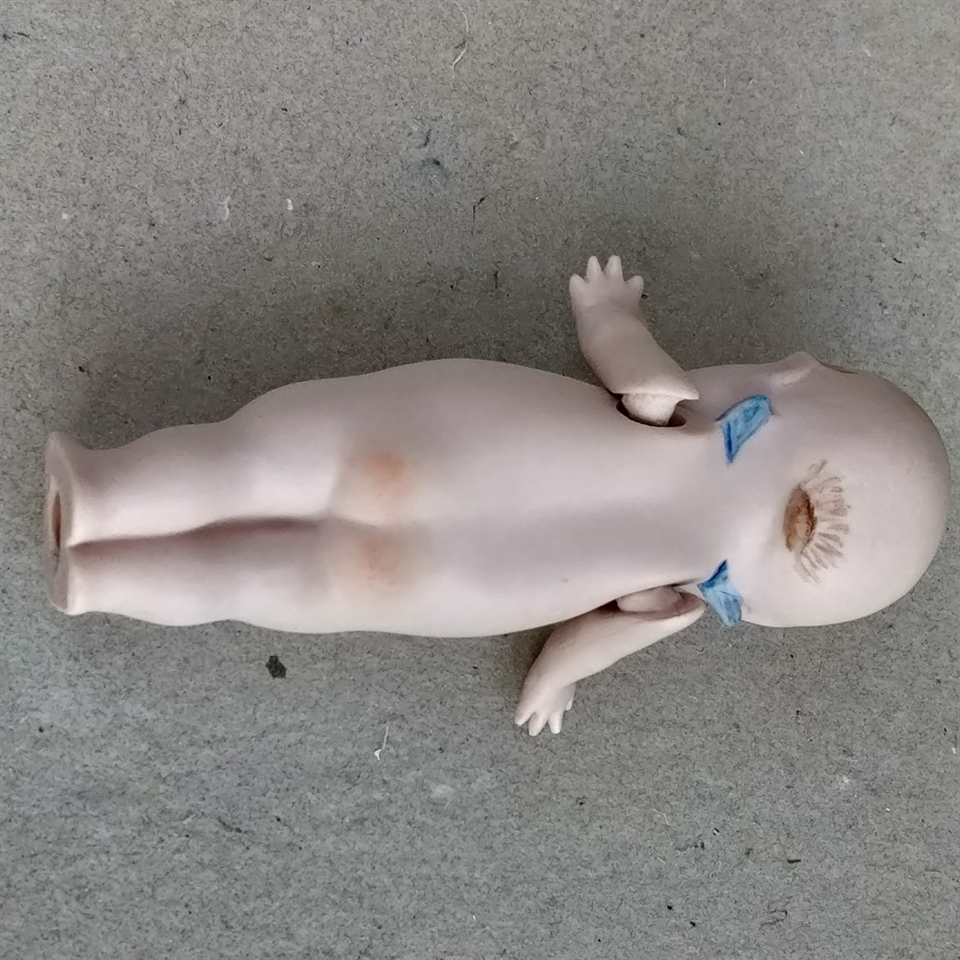 Oplev charmen af antik legetøj med 'Biscuit gammel dukke, bevægelige arme. BØ 91'.