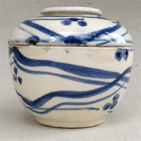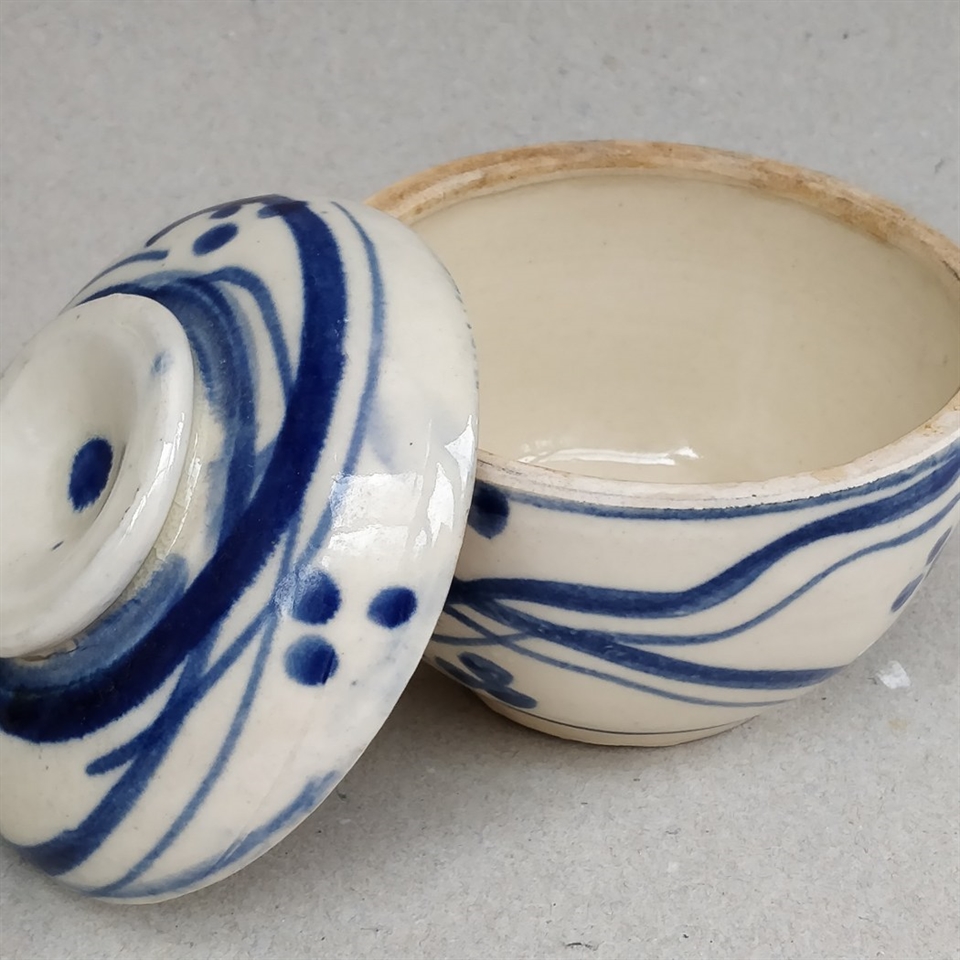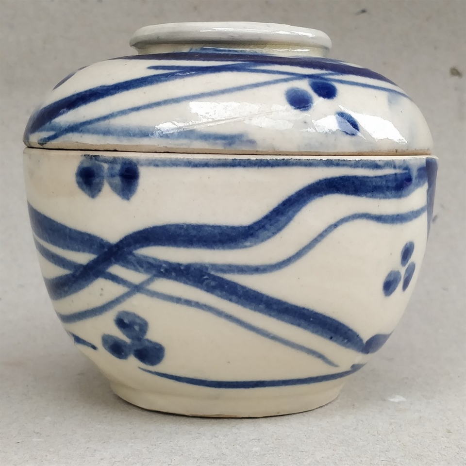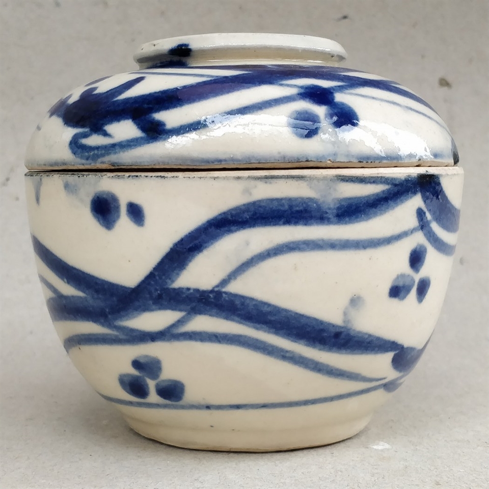 Opdag skønheden og charmen ved vores 'Blå creme gammel lerkrukke med låg', en autentisk asiatisk keramikkrukke, der vil tilføje et strejf af historie og elegance til enhver indretning.