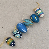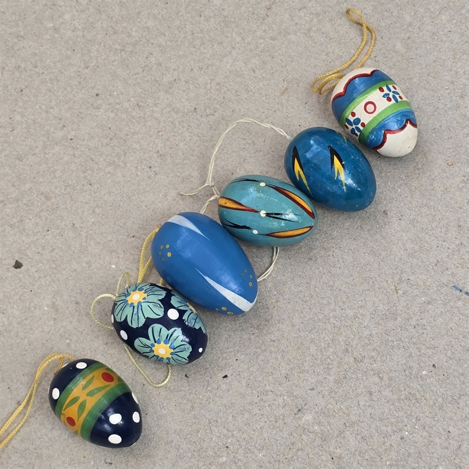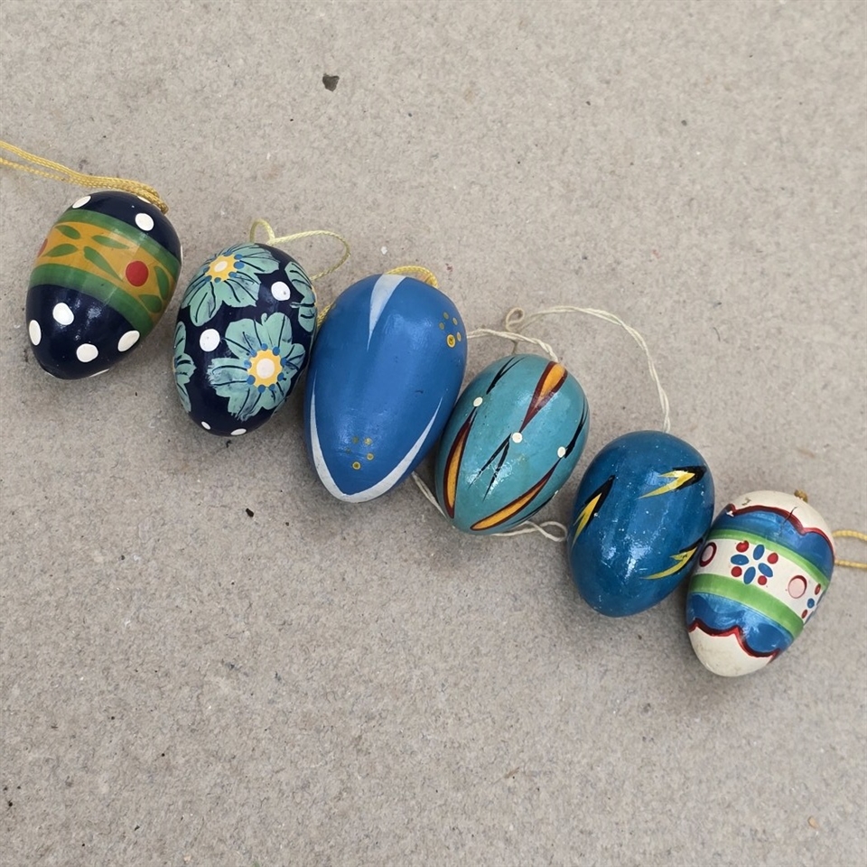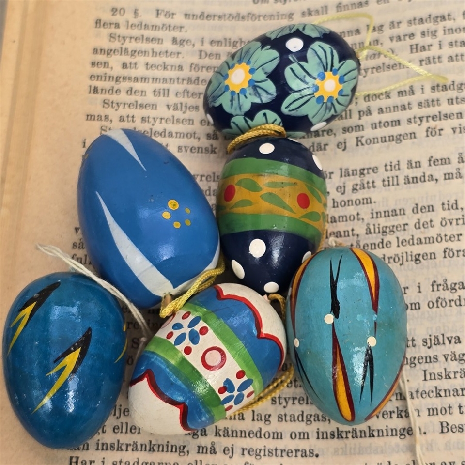 Disse seks nostalgiske trææg er perfekt håndmalede med iøjnefaldende blå mønstre, der tilføjer et strejf af vintage elegance til din påskefest.