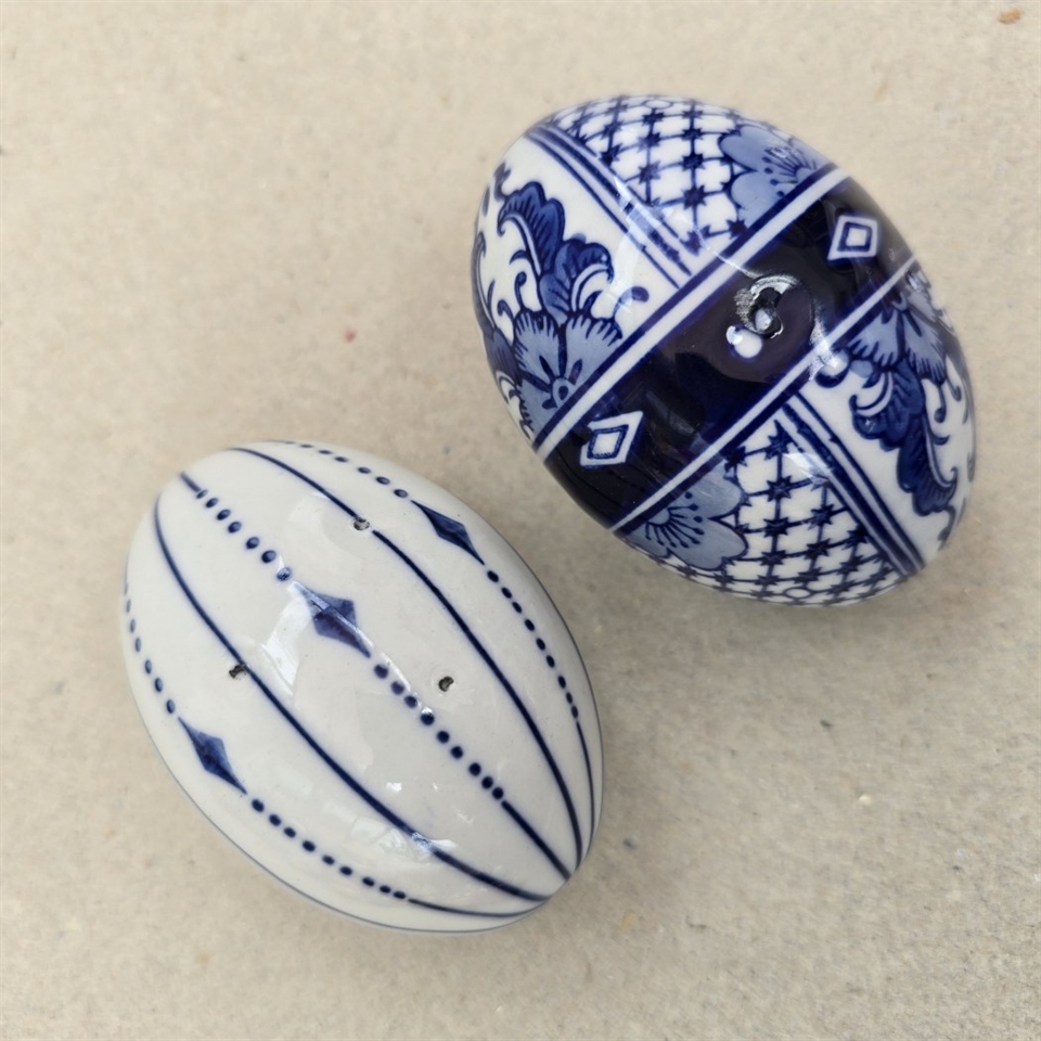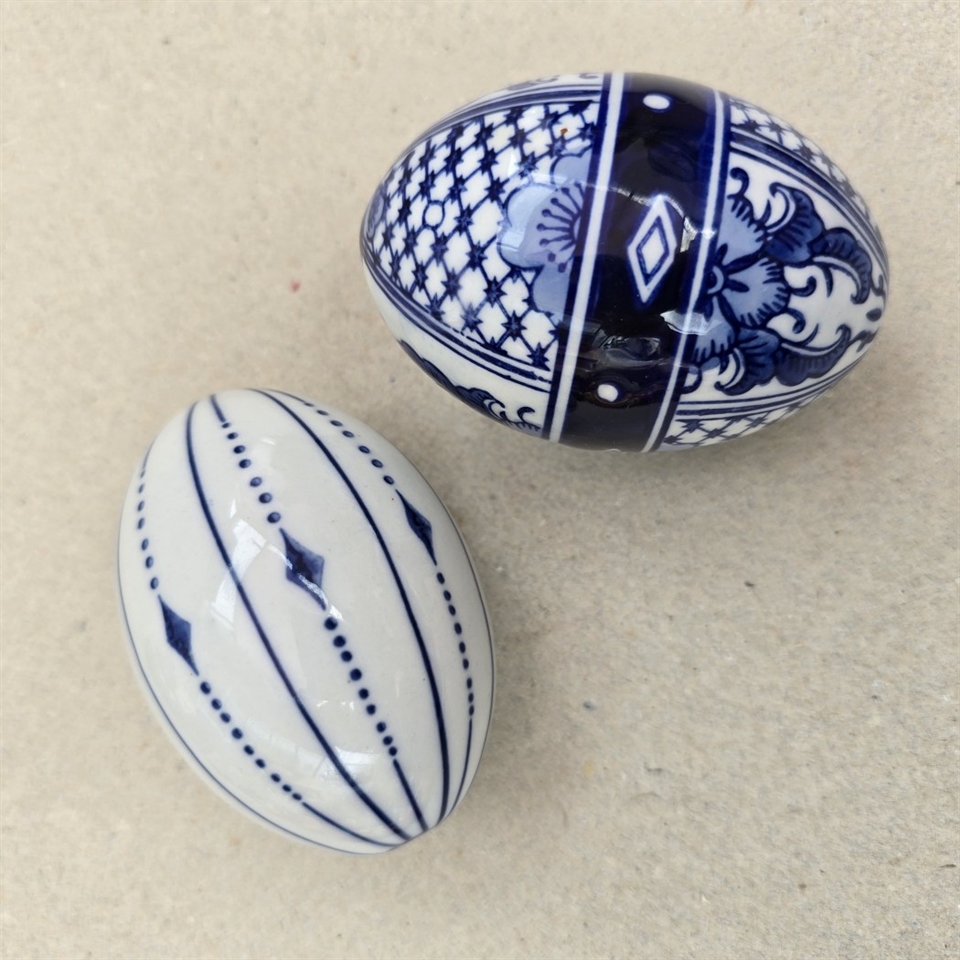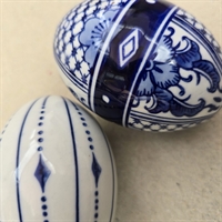 Hvert æg er omhyggeligt håndmalet med elegante blå og hvide mønstre, der tilfører et klassisk og tidløst touch til ethvert rum. Små skønhedsfejl i glasuren.