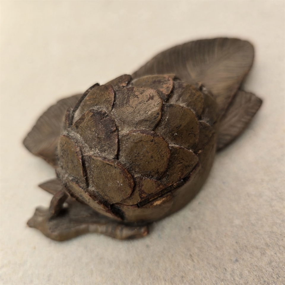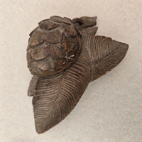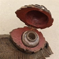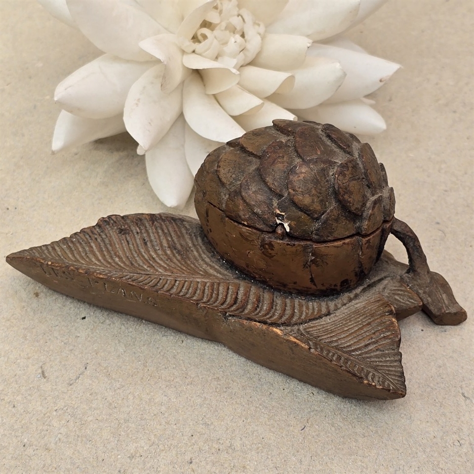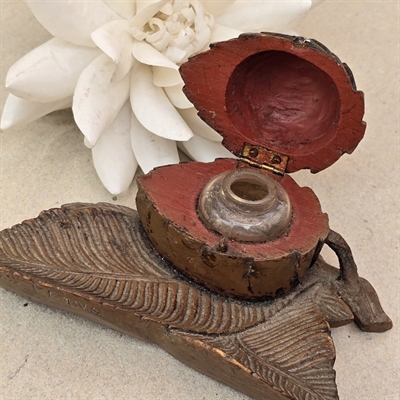 Blækhuset er ikke kun en praktisk genstand for dine blækbehov, men også et kunstværk. Med sin brunlige farve og detaljerede blade, der understøtter koglen, er det både æstetisk tiltalende og funktionelt. Inde i trækoglen finder du en lille glasbeholder, perfekt til at holde dit blæk sikkert og stilfuldt.