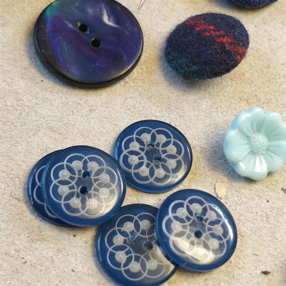 Opdag skønheden og charmen i vores eksklusive 'Blandet lot blå vintage knapper i plastik'. Hver knap i dette sæt er nøje udvalgt for at tilføre et strejf af retro elegance til dine syprojekter eller kreative dekorationer.