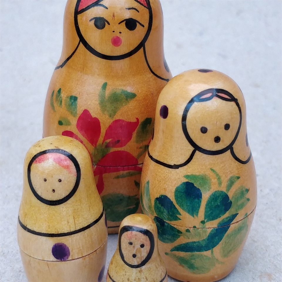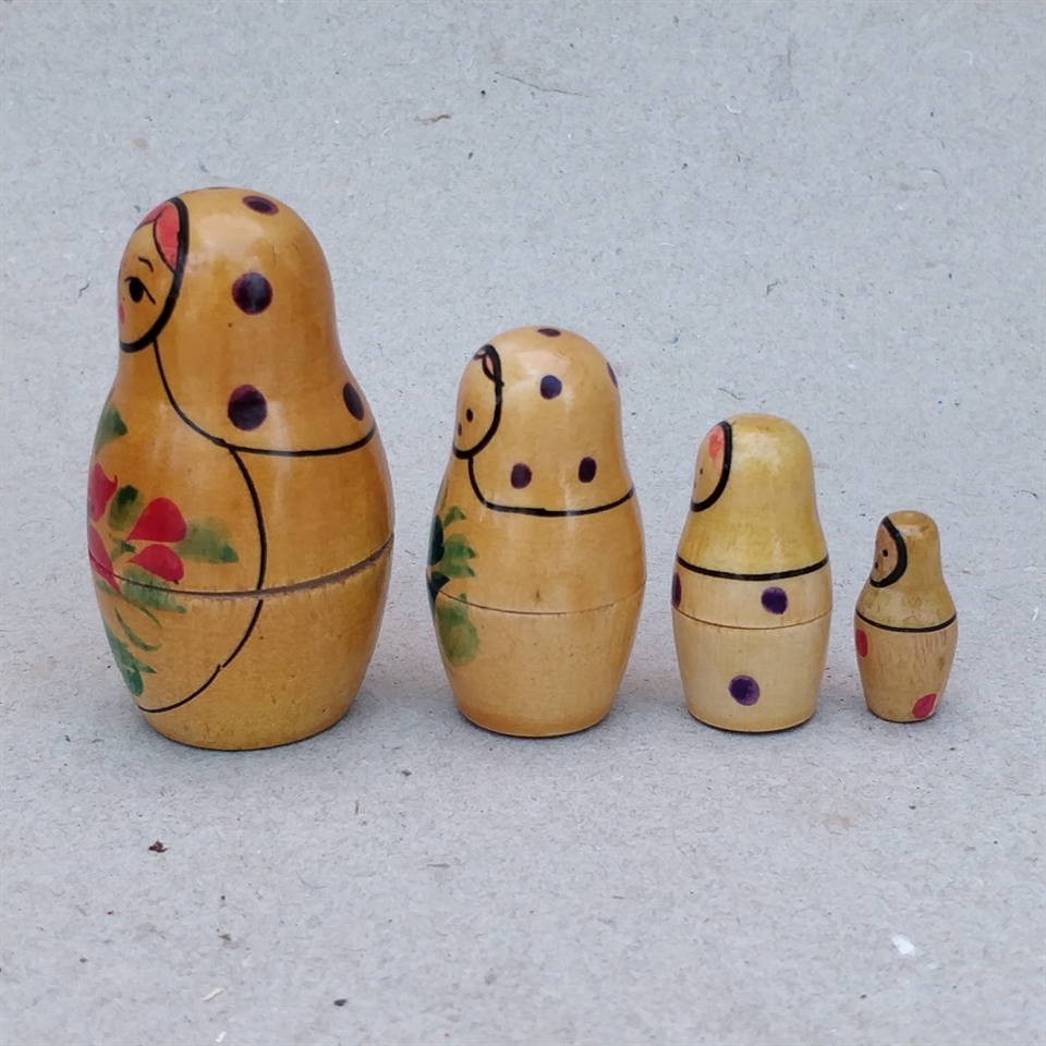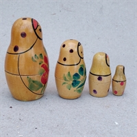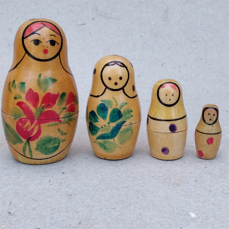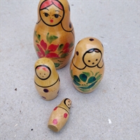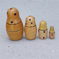 Sættet inkluderer fire håndmalede dukker, der varierer i størrelse fra 2,9 til 7,2 cm.