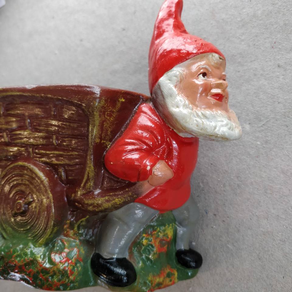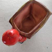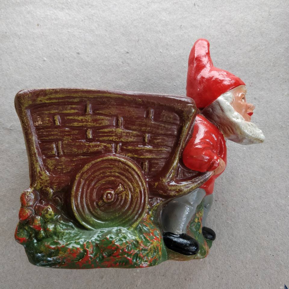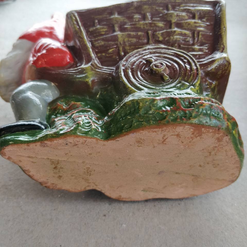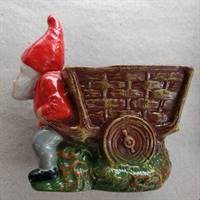 Denne særprægede blomsterskjuler er udført i keramik og forestiller en glad julemand med et stort skæg og nissehue, som trækker en lille vogn.