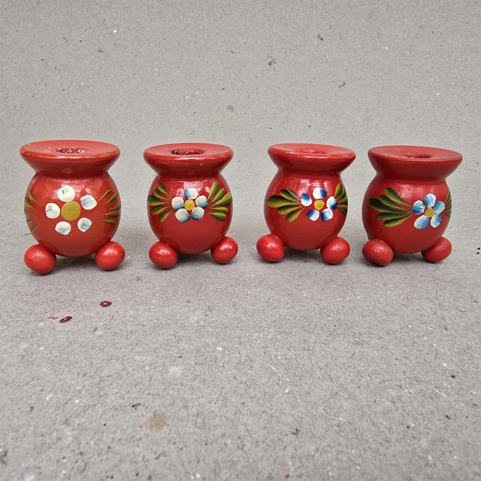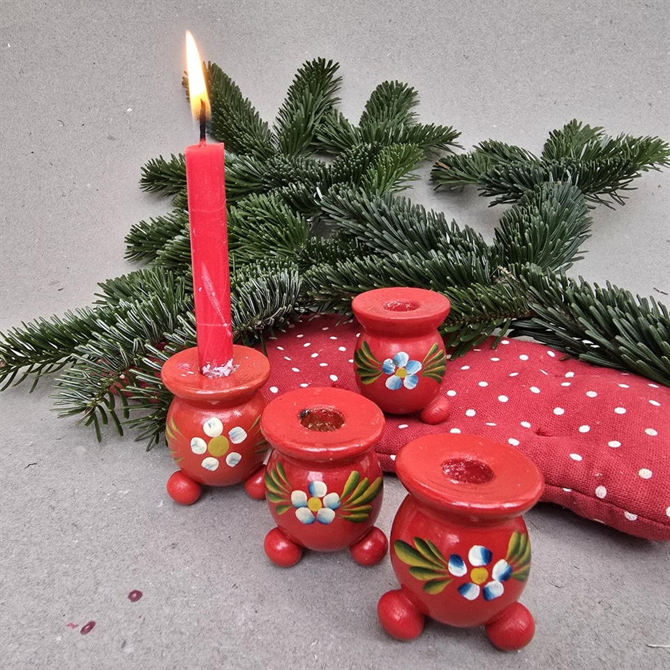 Hver lysestage er 4,8 cm. høj og er omhyggeligt udsmykket med håndmalede blomstermotiver, der tilføjer et personligt og kunstnerisk touch til dit julebord.