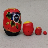 Dette smukke sæt består af fire delbare trædukker, som er kunstfærdigt dekoreret i en iøjnefaldende farvepalet af rød, guld og sort.