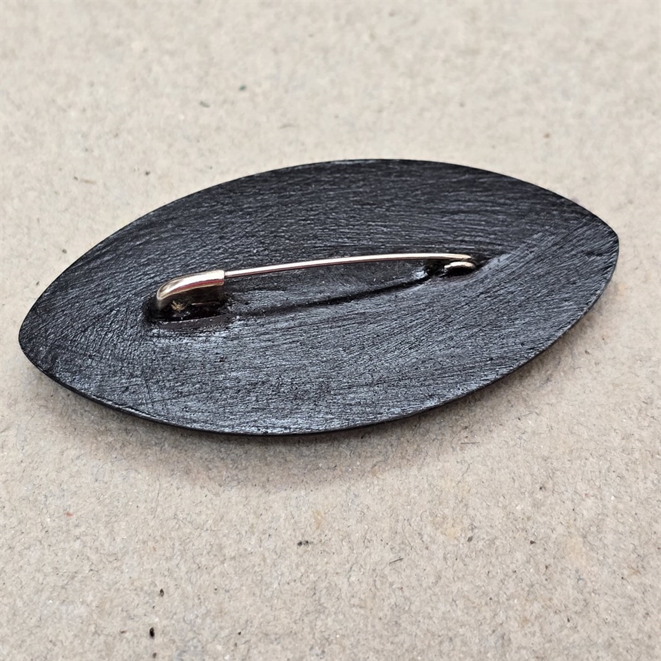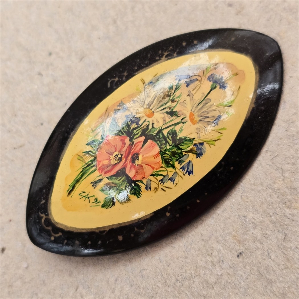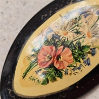 Forestil dig en oval form smukt indrammet af en klassisk sort kant, hver detalje nøje håndmalet for at fremhæve de farverige blomstermotiver. Den måler 6,5 x 3,5 cm., den perfekte størrelse til at fange øjet uden at være overvældende.