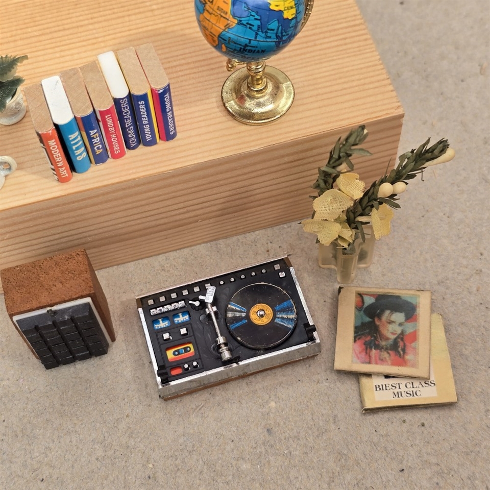 Opdag en verden af miniatureundere med sættet 'Bøger, globus, pladespiller og billeder til dit dukkehus. Genbrug.'! Dette enestående sæt bringer nostalgi og charme ind i dit dukkehus med autentiske retroelementer, perfekt til at skabe en unik og personlig atmosfære.