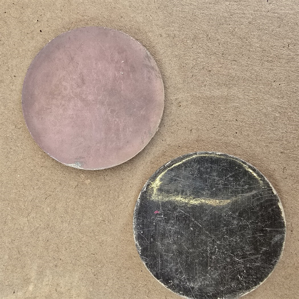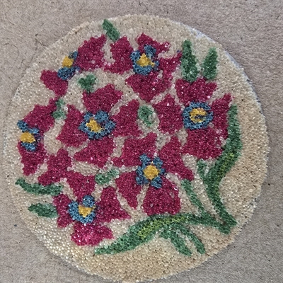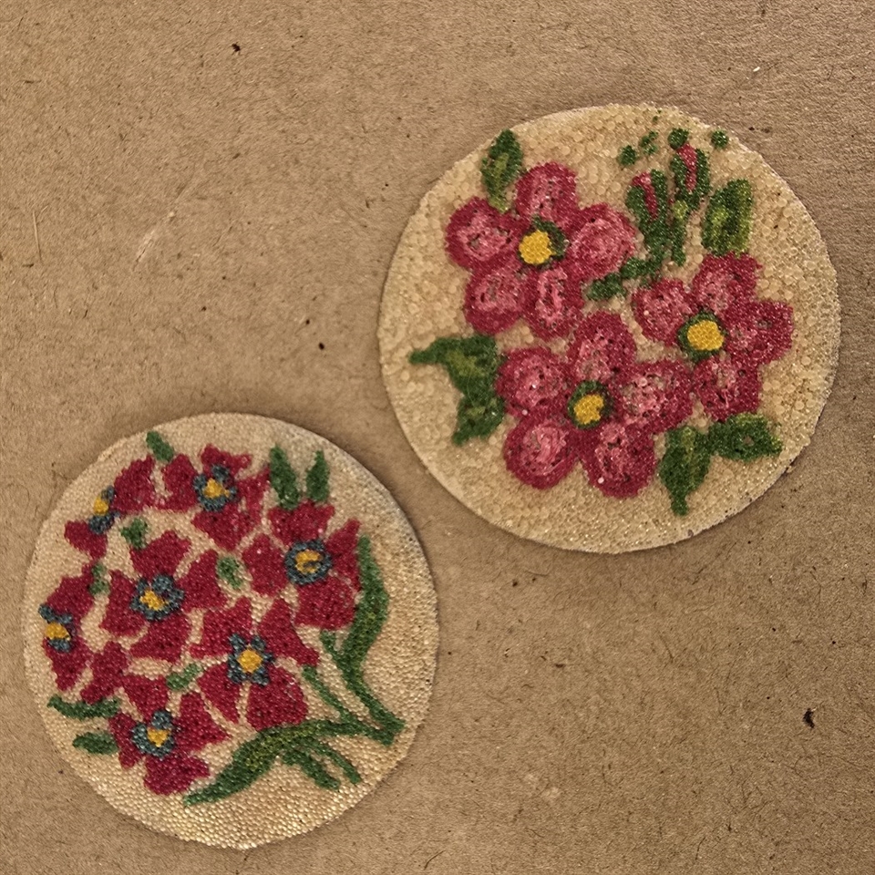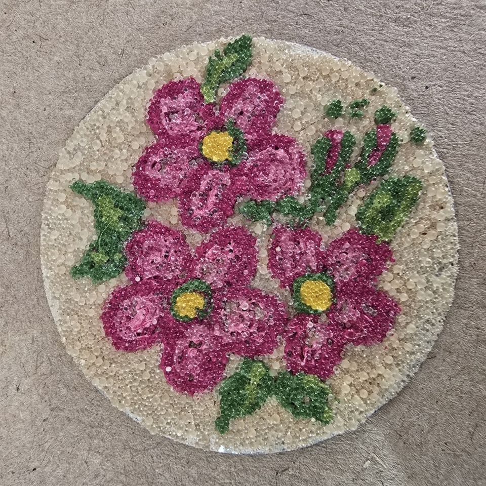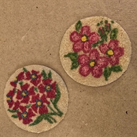 Hver plade måler 4,2 cm. i diameter og fremviser en detaljerig blomsterbuket lavet af fine mini glasperler, på en rund metalplade.