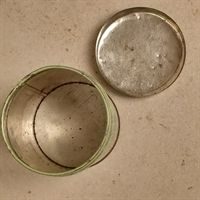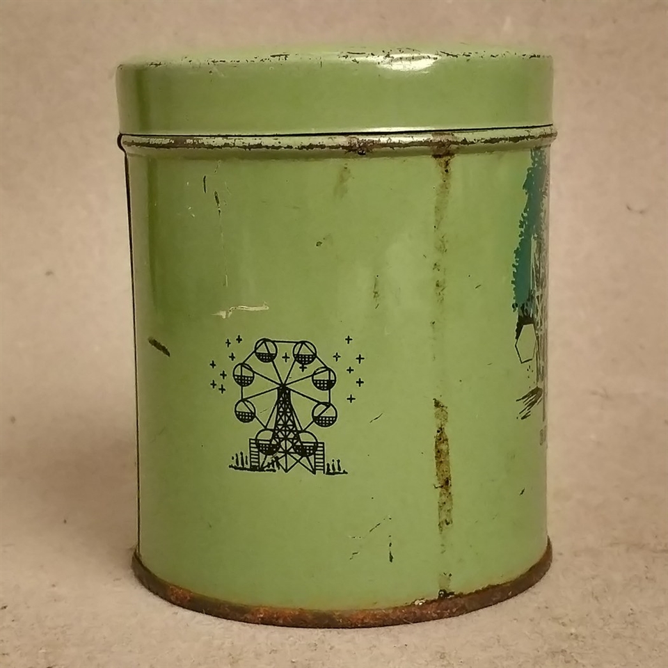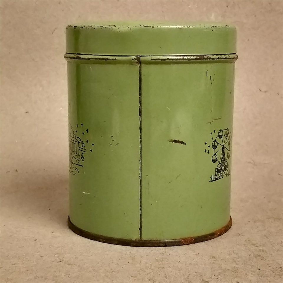 Produktbeskrivelse: - **Farve**: Lysegrøn med sort tekst og billede - **Materiale**: Metal, robust og holdbar, ideel til genbrug og dekoration - **Dimensioner**: 9 cm. i diameter, 11 cm. høj - **Design**: Traditionelt og stilfuldt, perfekt til at fremvise som en del af hjemmets dekor
