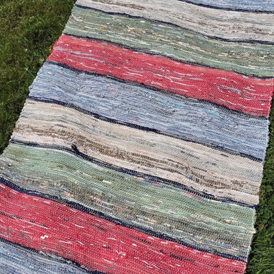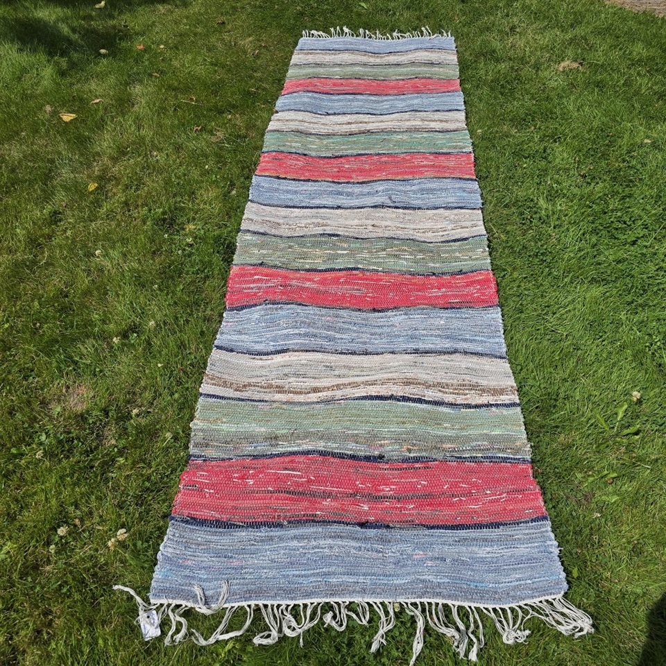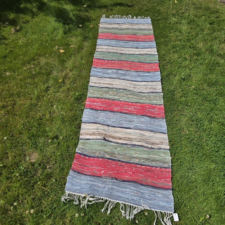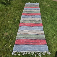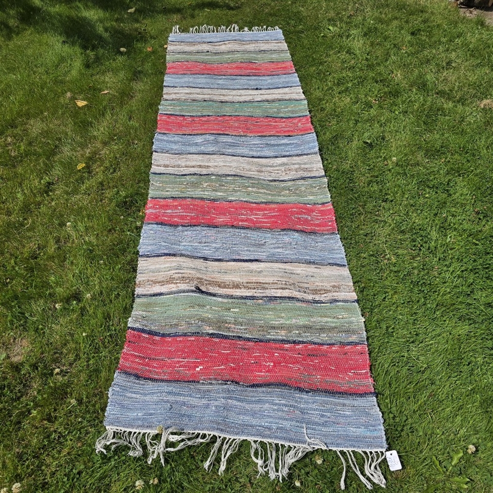 Denne autentiske svenske løber, fremstillet af genbrugte materialer, måler 81 x 290 cm., hvilket gør det ideelt til at tilføje varme og karakter til lange gange eller større rum.