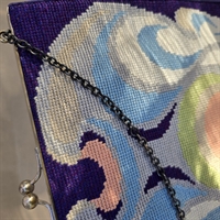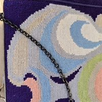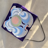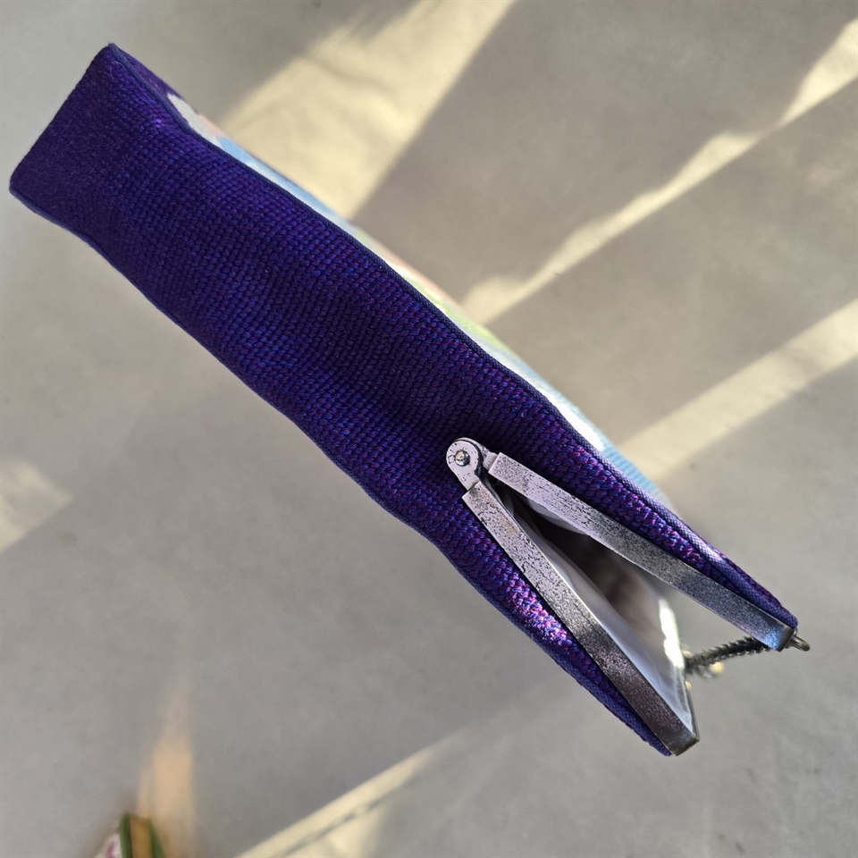 Denne eksklusive aftentaske er omhyggeligt håndbroderet med et organisk mønster i en dyb palet af lilla, lyseblå, lysegrøn, hvid og sart orange, som tilfører et strejf af farve og personlighed til ethvert outfit.