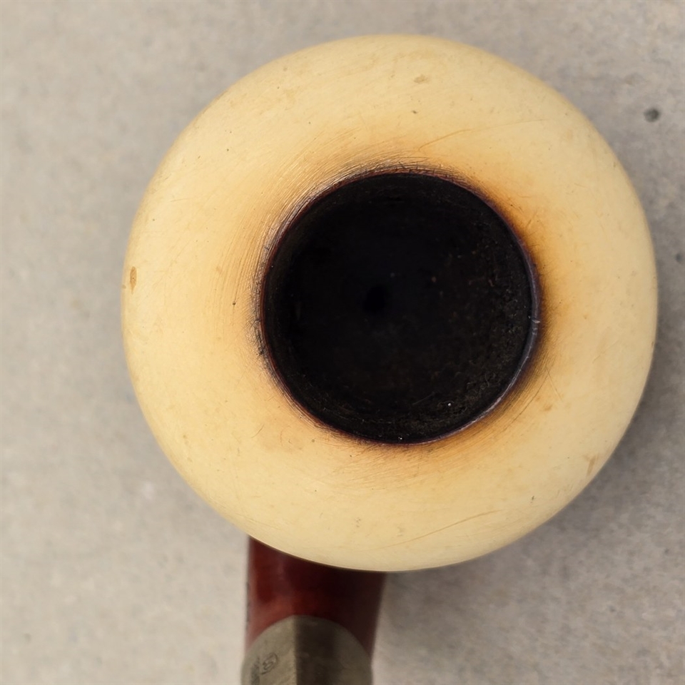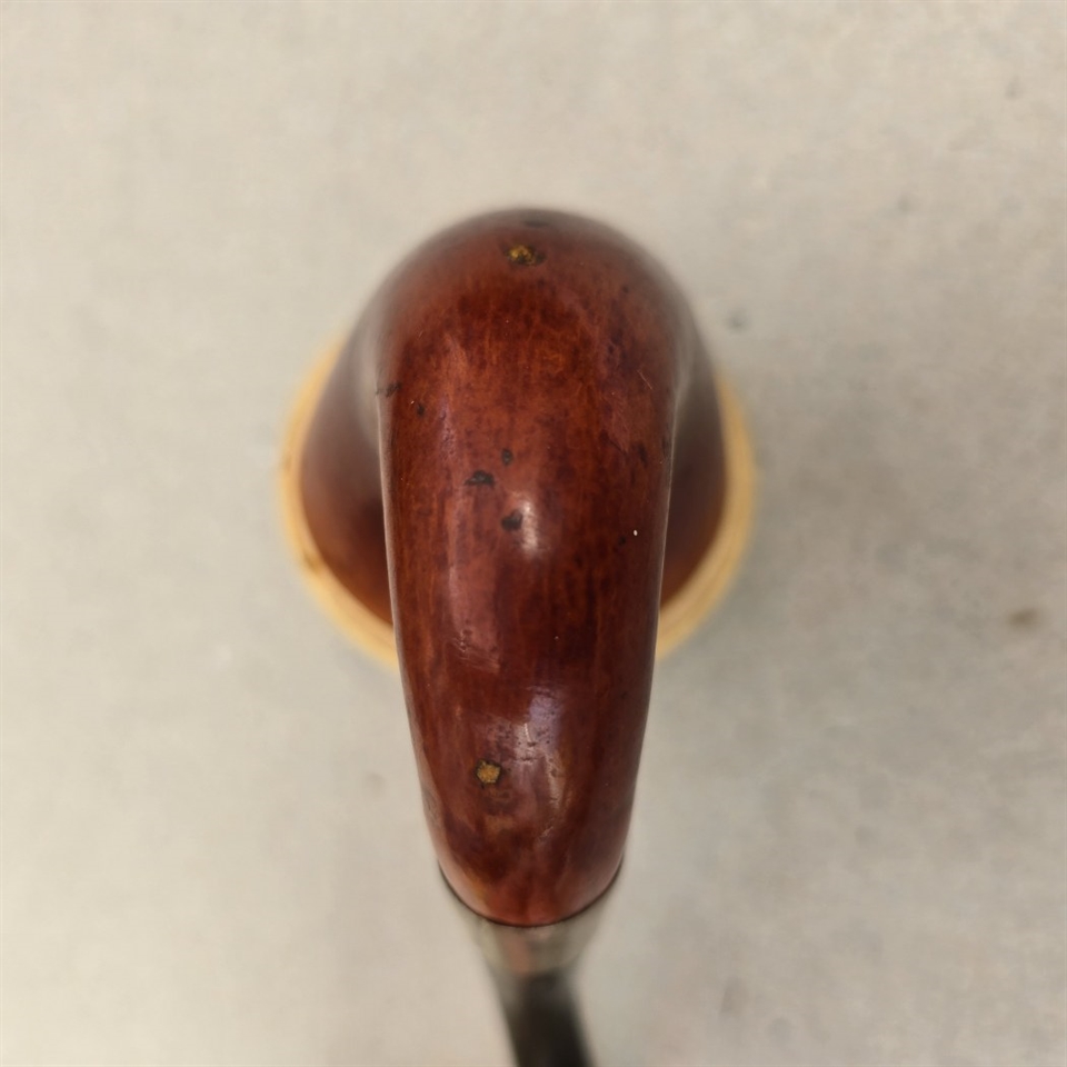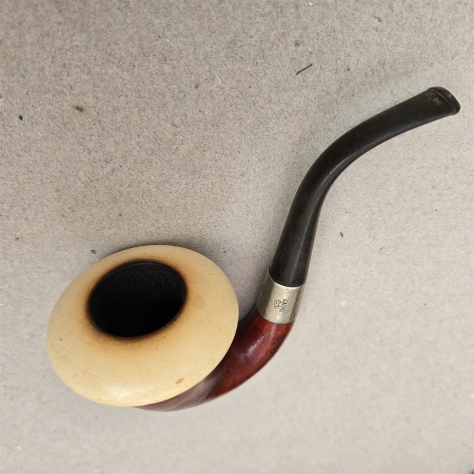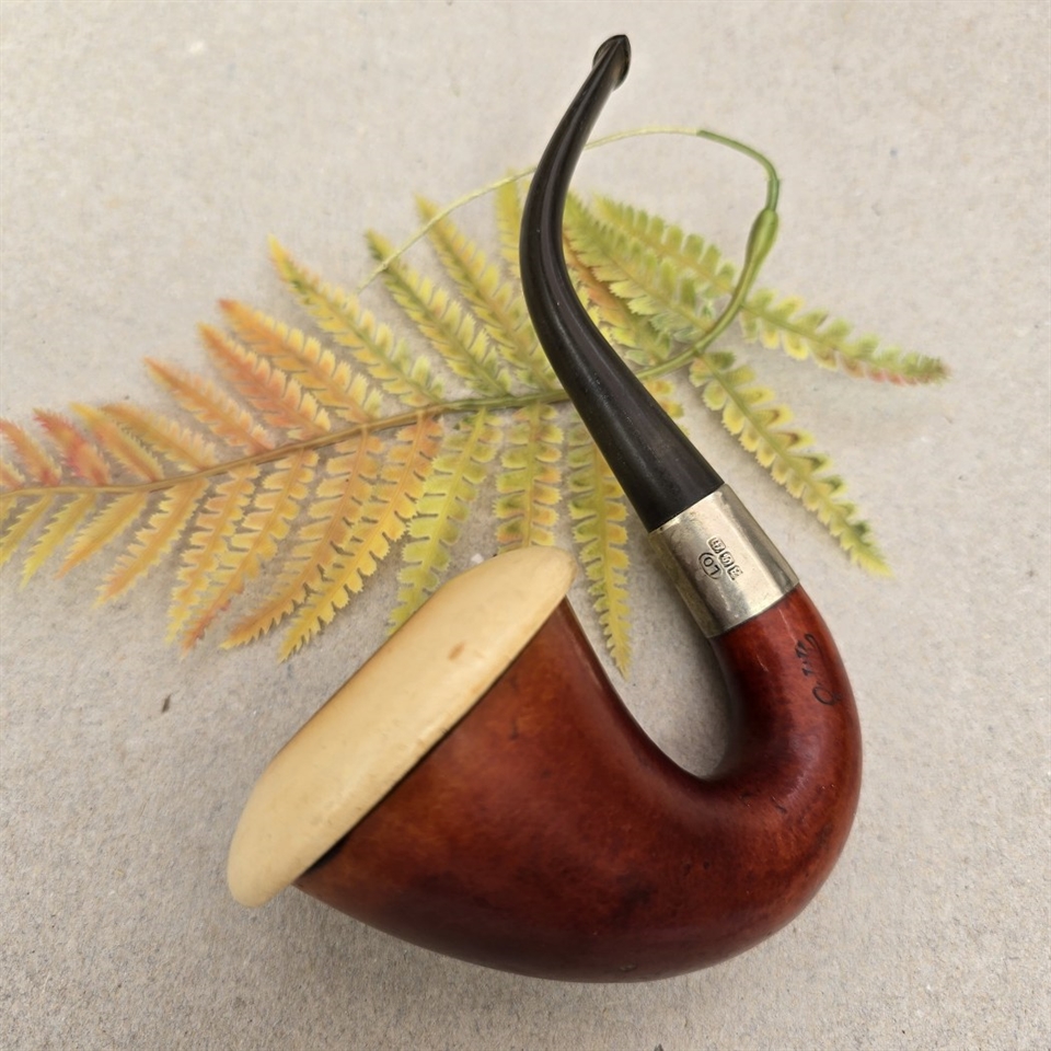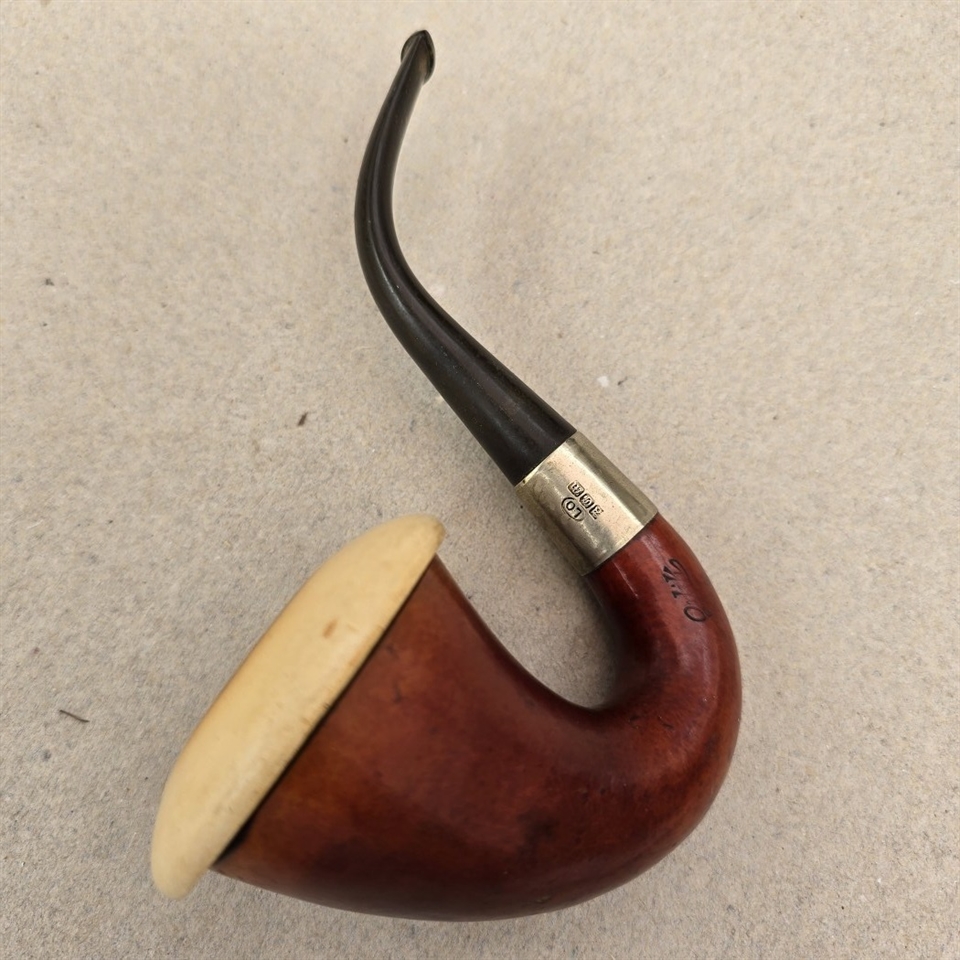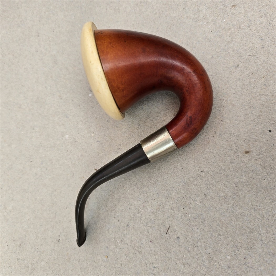 Opdag charmen og elegance af vores 'Buet gammel hyggelig pibe, brunt med creme top'. Denne unikke pibe er designet med øje for detaljer og tradition, hvilket gør den til et must-have for enhver pibeentusiast.
