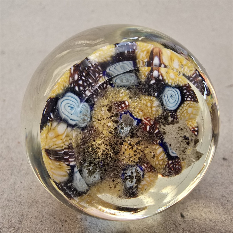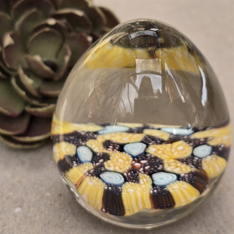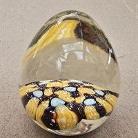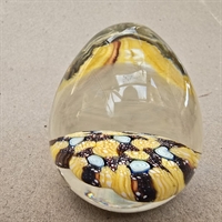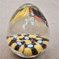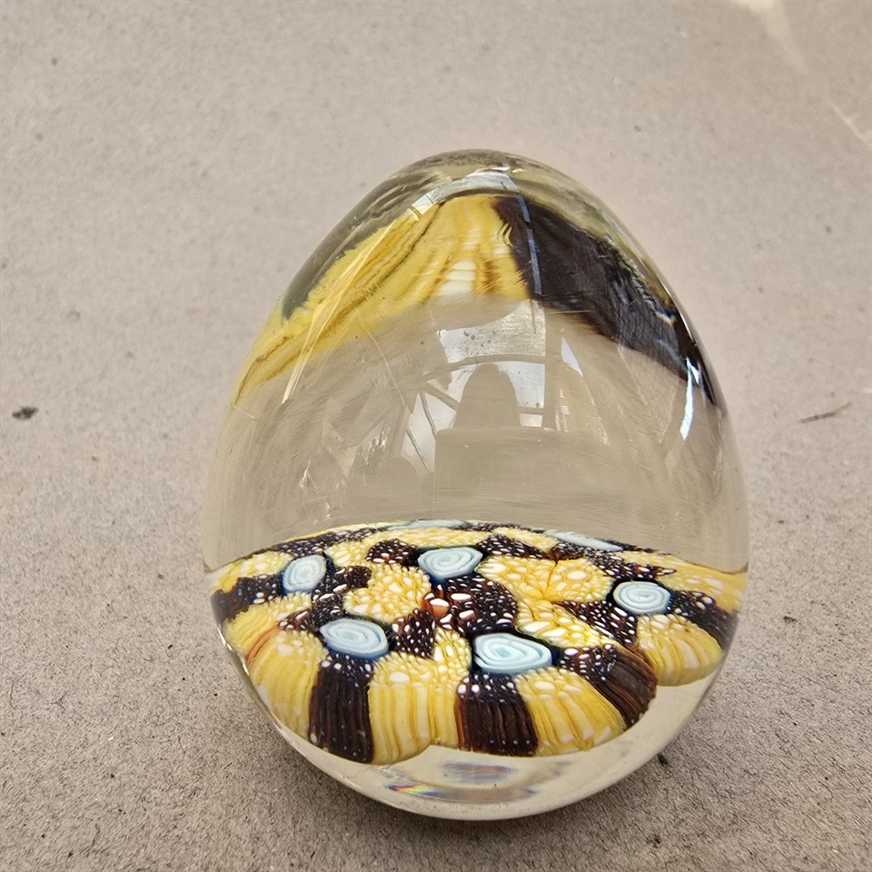 Dette æggeformede vidunder er ikke blot en brevpresse, men et stykke kunst, der fanger øjet med sin smukke kombination af klare og farverige bunde i gult, brunt og lyseblåt.