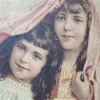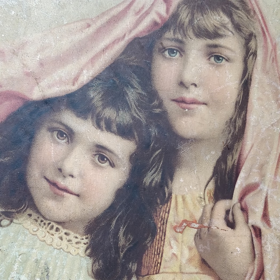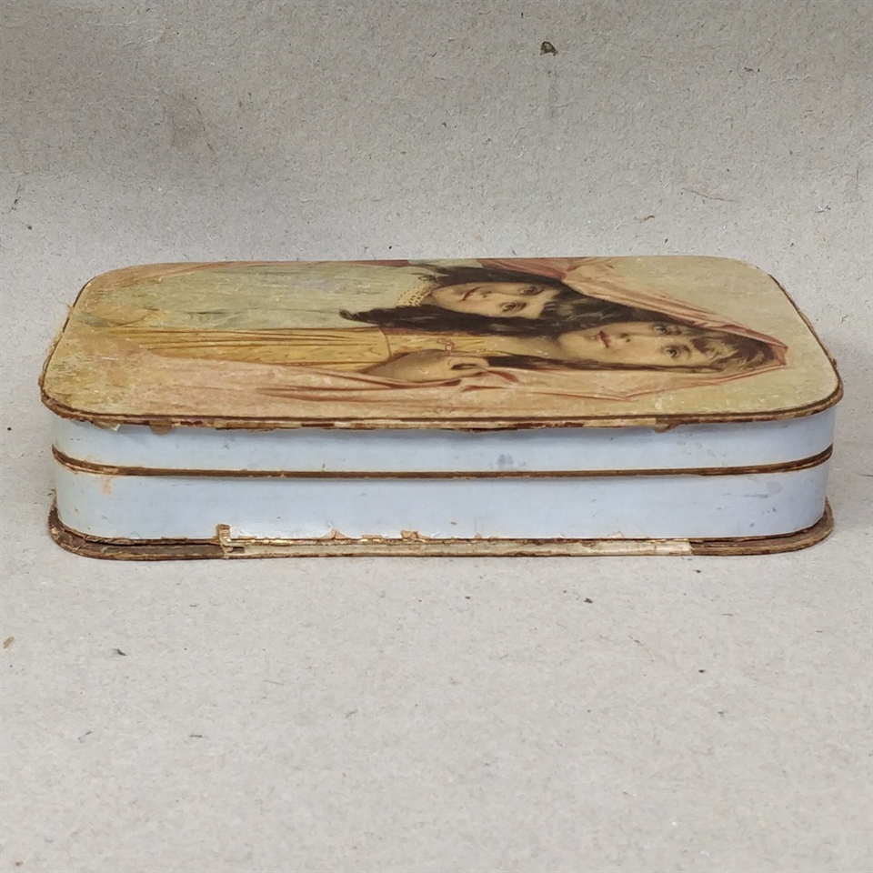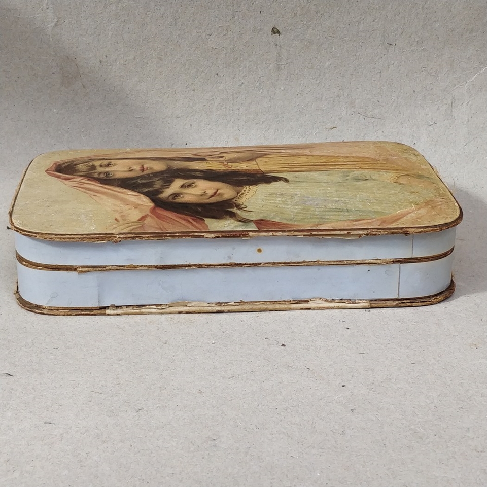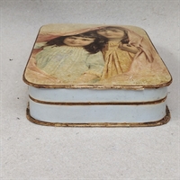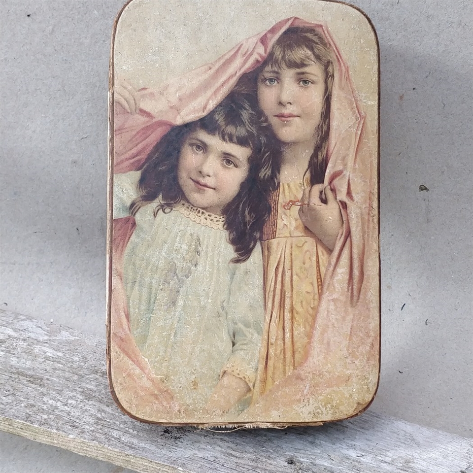Denne æske er prydet med et smukt motiv af to piger under et tørklæde, som tilføjer en klassisk og tidløs æstetik til designet.