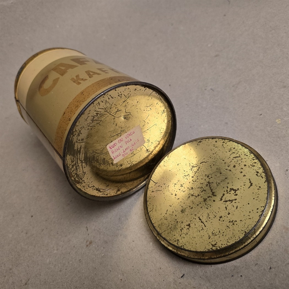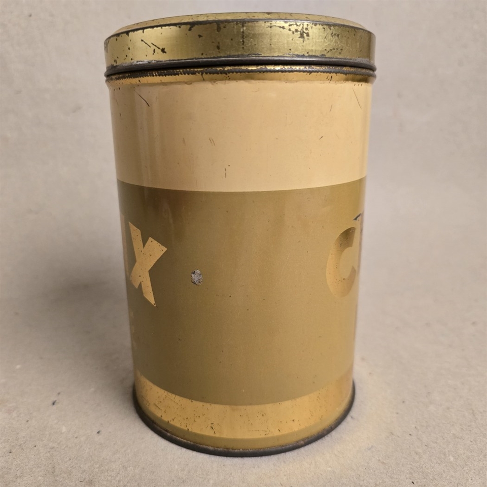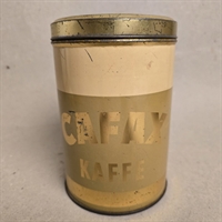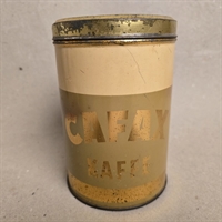 Denne elegante kaffedåse er designet til at vække minder med sin creme-beige farve og eksklusive guldtekst, der elegant fremhæver mærket Cafax Kaffe.