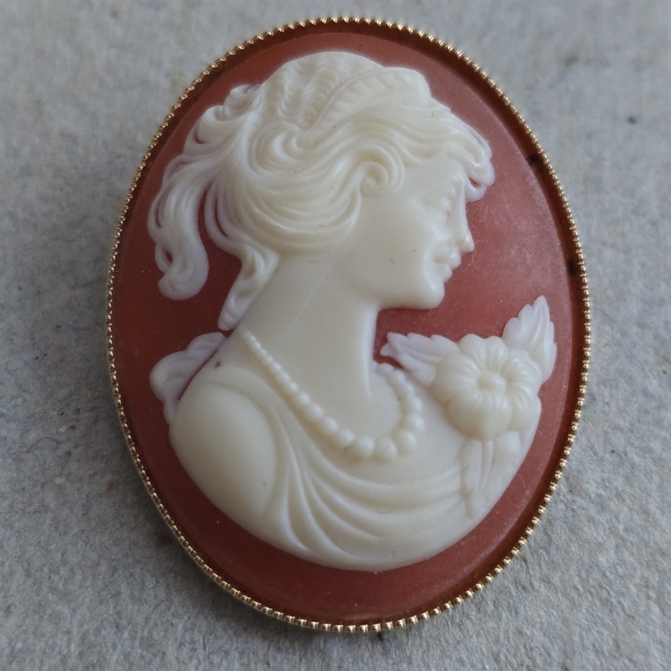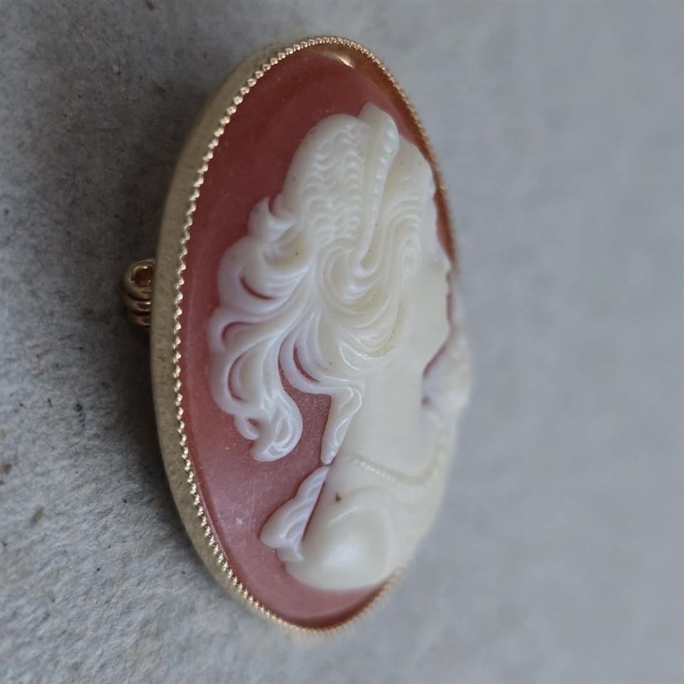 Oplev tidløs elegance og udsøgt håndværk med vores "Camé vintage broche, med guldfarvet indfatning." Dette mesterværk er en ægte hyldest til klassisk skønhed. Indrammet med en strålende guldfarvet kant, der tilføjer et strejf af luksus og fornemhed.