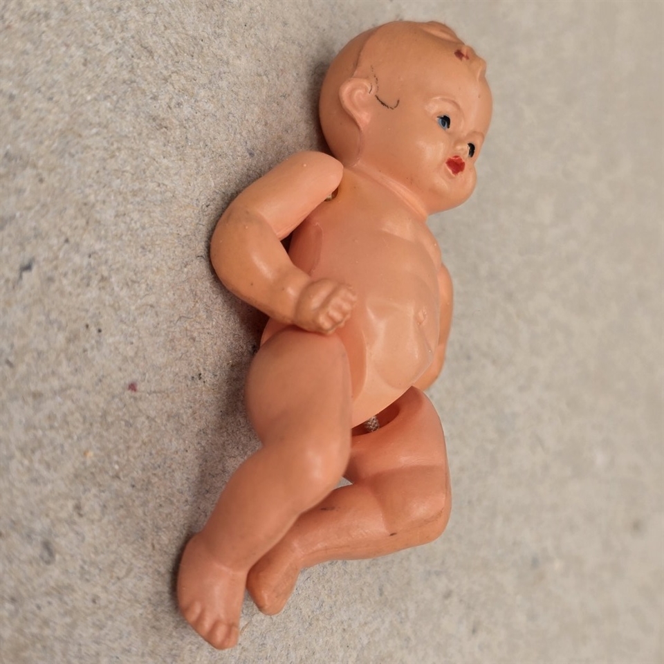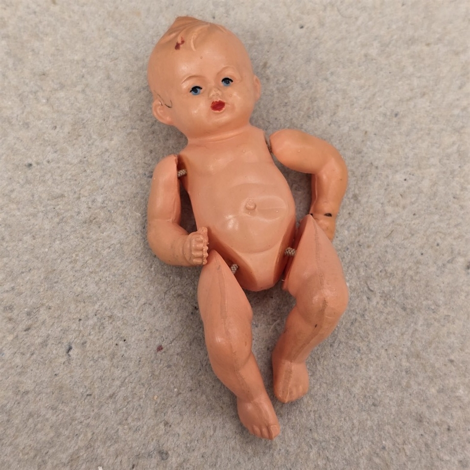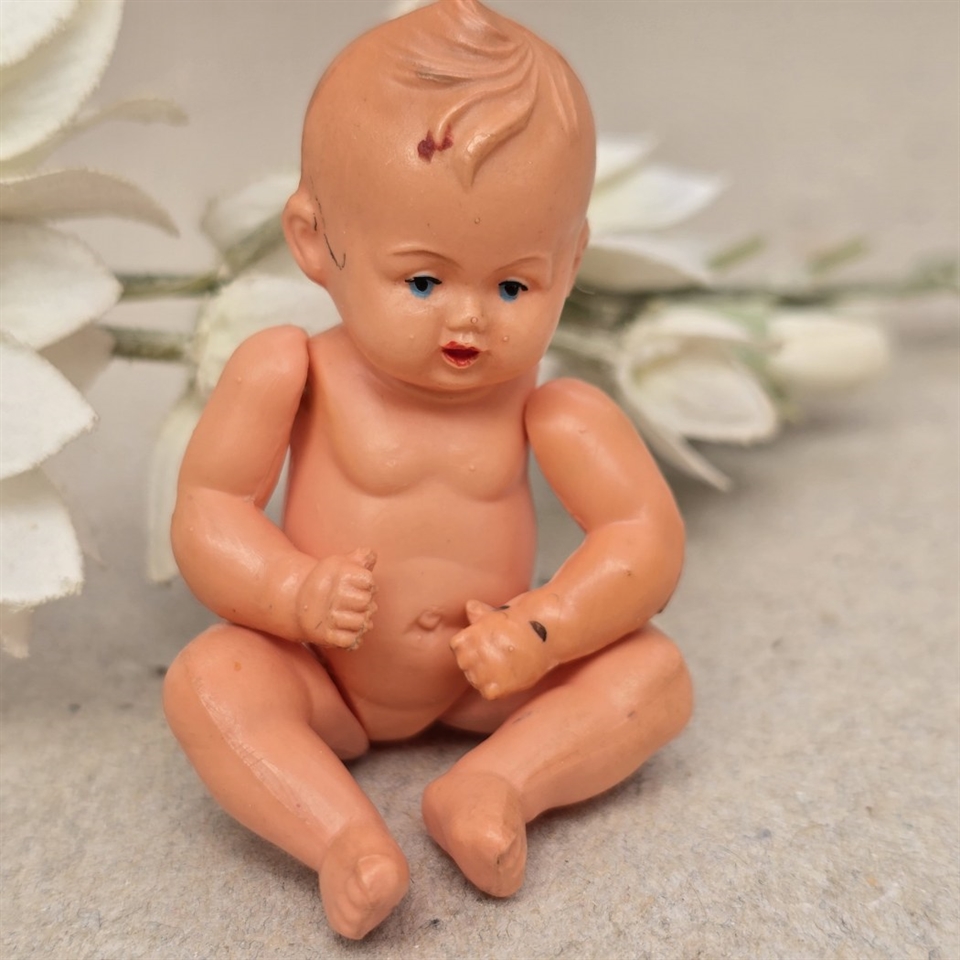 Opdag en sjælden skat til din samling med "Celluloid Lille Gammel Baby Dukke med Blå Øjne"! Denne charmerende vintage babydukke er en perfekt repræsentation af tidløs skønhed og nostalgi. Dukken er kun 7,5 cm. lang, men dens detaljerigdom og udtryk er intet mindre end imponerende.