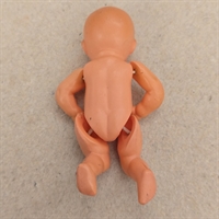 Denne lille perle er fremstillet af celluloid, hvilket giver den en fin glans og en delikat følelse, som er karakteristisk for ældre dukker. Dukkens ansigt er prydet med en sød rød mund og dybe blå øjne, der tilføjer en livlig og indtagende karakter til dens udseende.