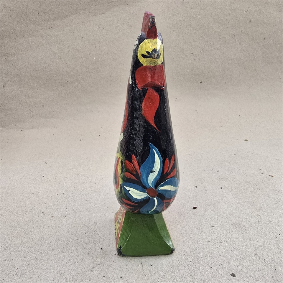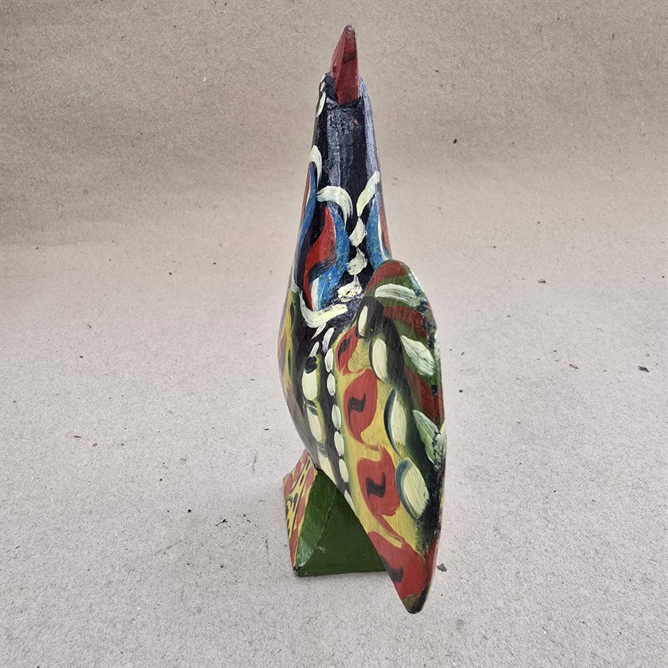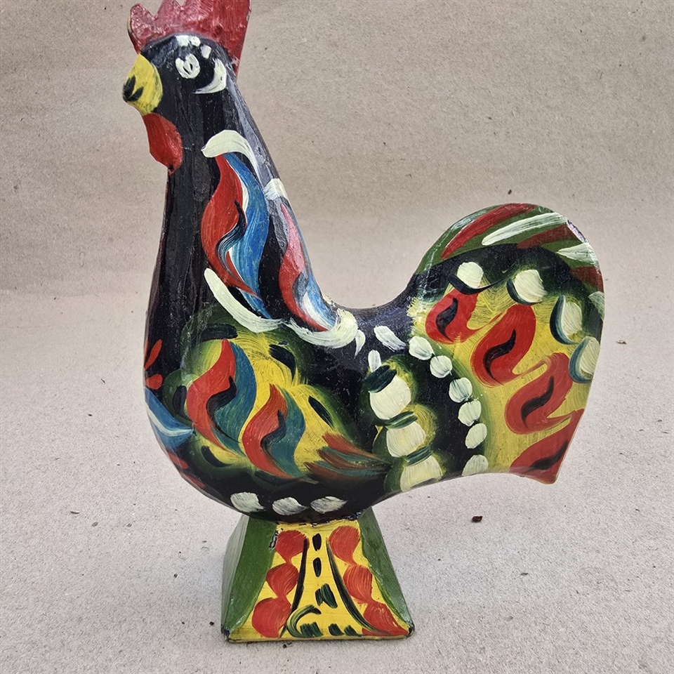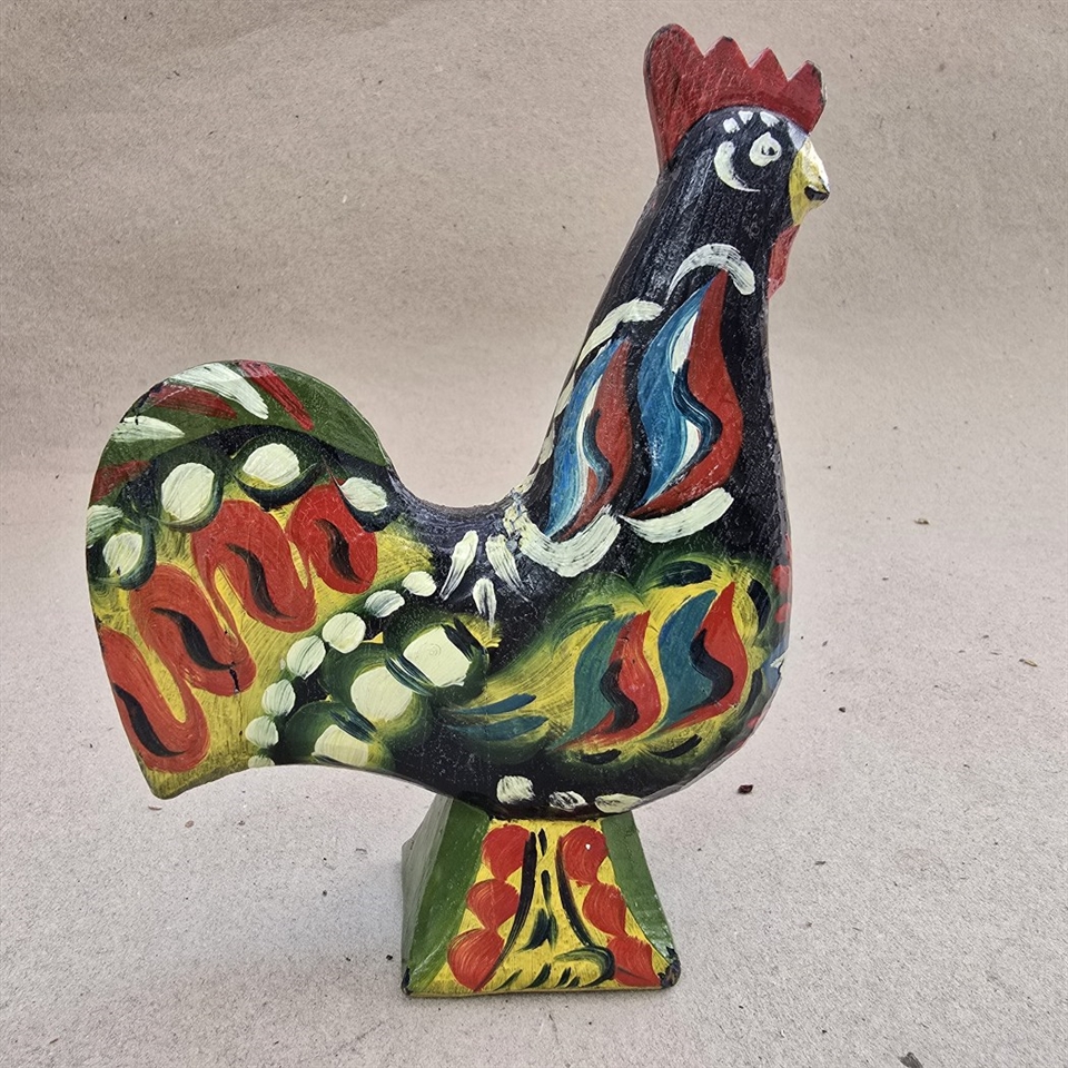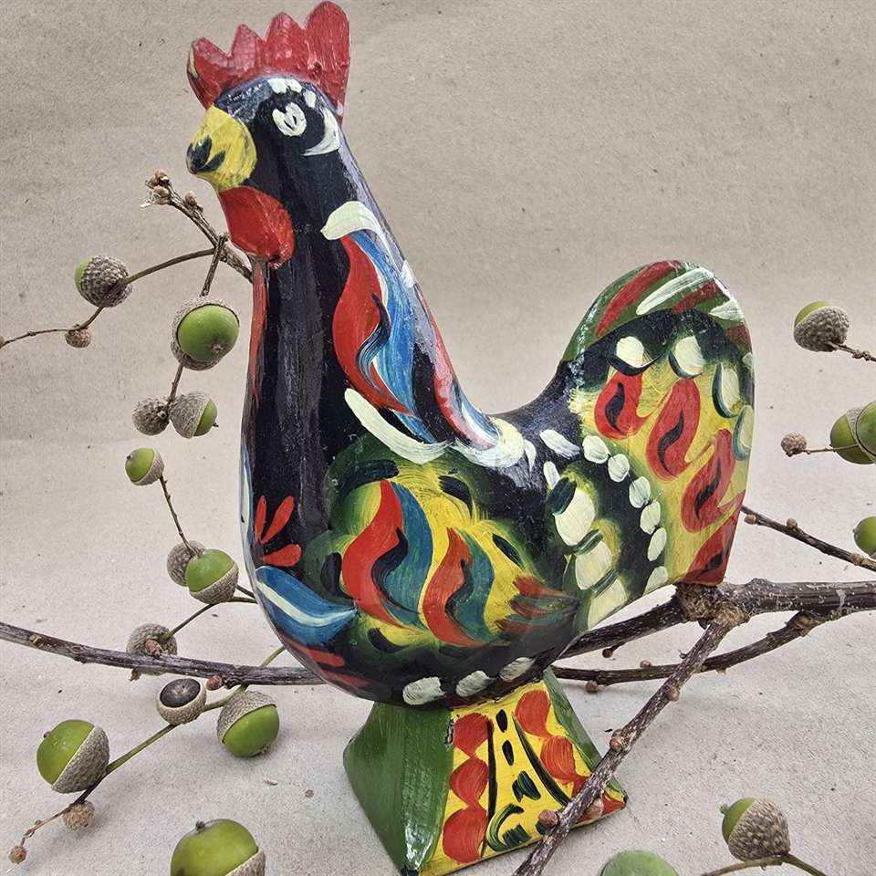 Den er omhyggeligt udskåret og malet for hånd, hvilket gør hver hane unik med sin egen karakteristiske charme.