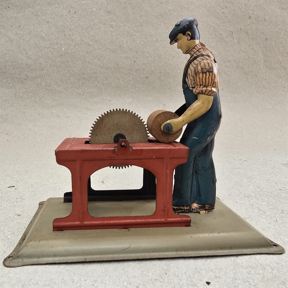 Denne charmerende lille metalfigur repræsenterer en flittig arbejdsmand klædt i sine ikoniske blå overalls, travlt beskæftiget ved rundsaven. Perfekt til samlere eller som en kreativ gave, denne figur er ikke kun et legetøj, men et lille kunstværk.