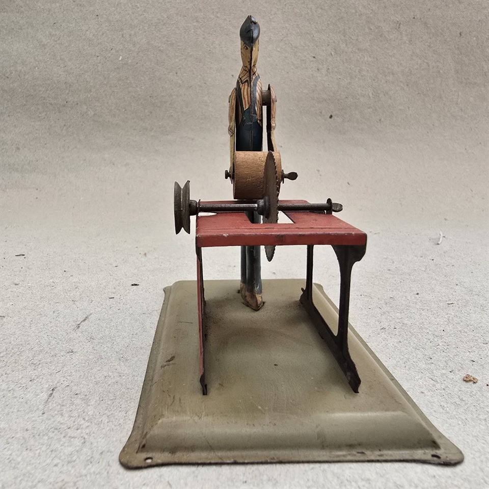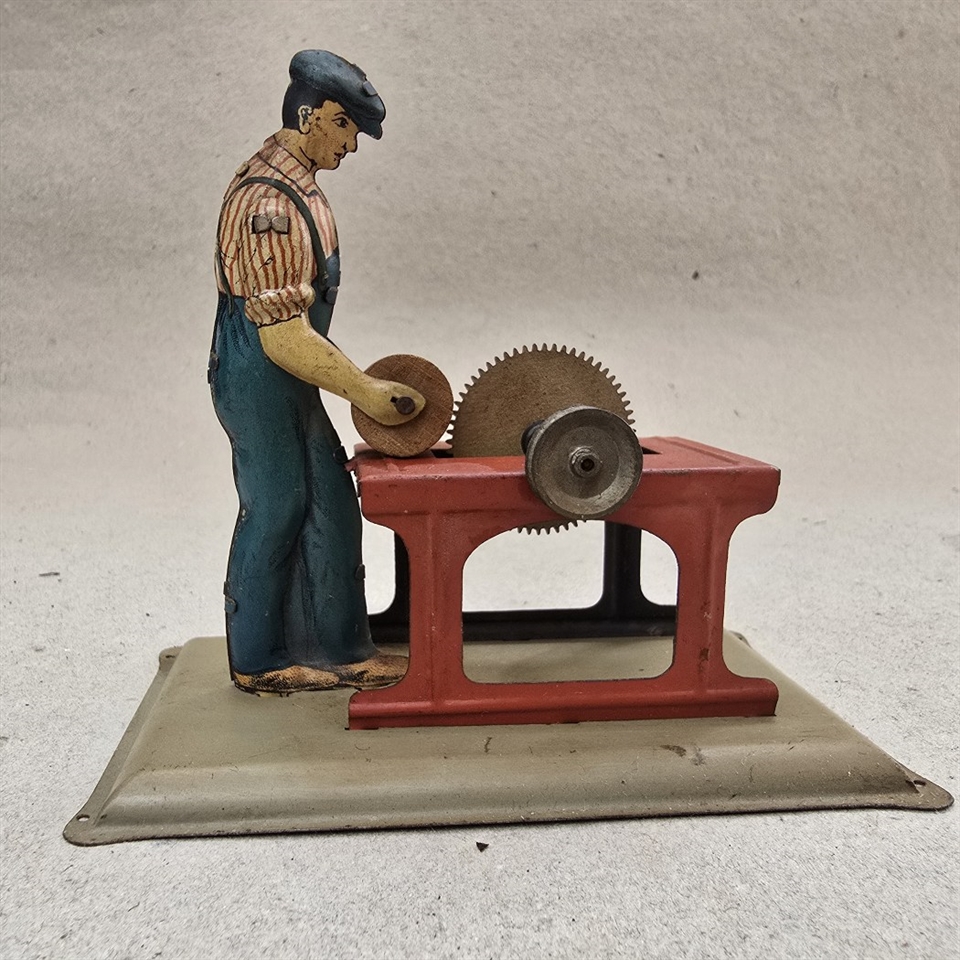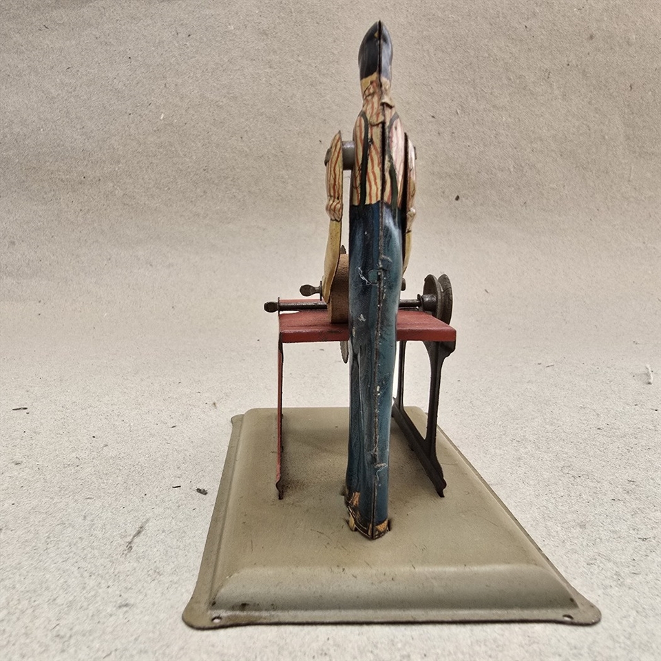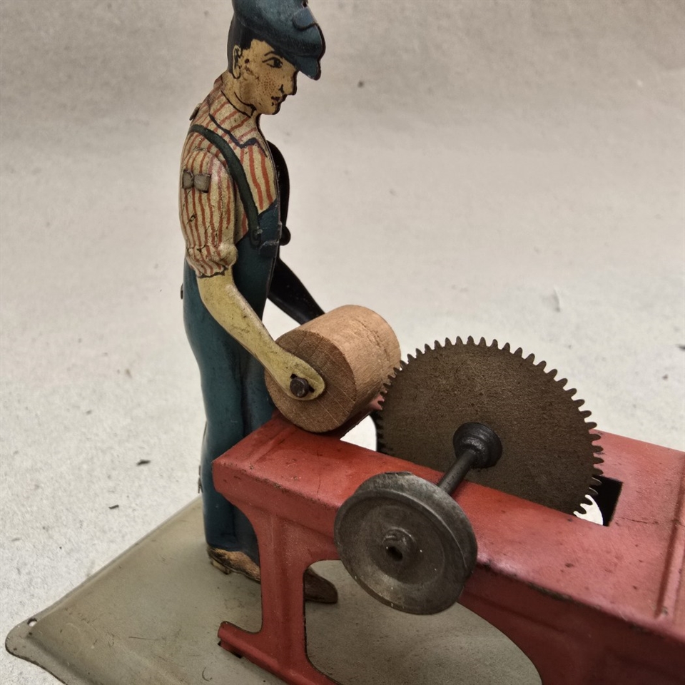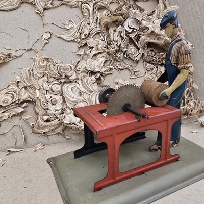 Oplev charmen af nostalgi med vores "Dampmaskine metalfigur med sav i blå overalls" – et unikt stykke gammelt legetøj, der bringer historiens sus med sig.
