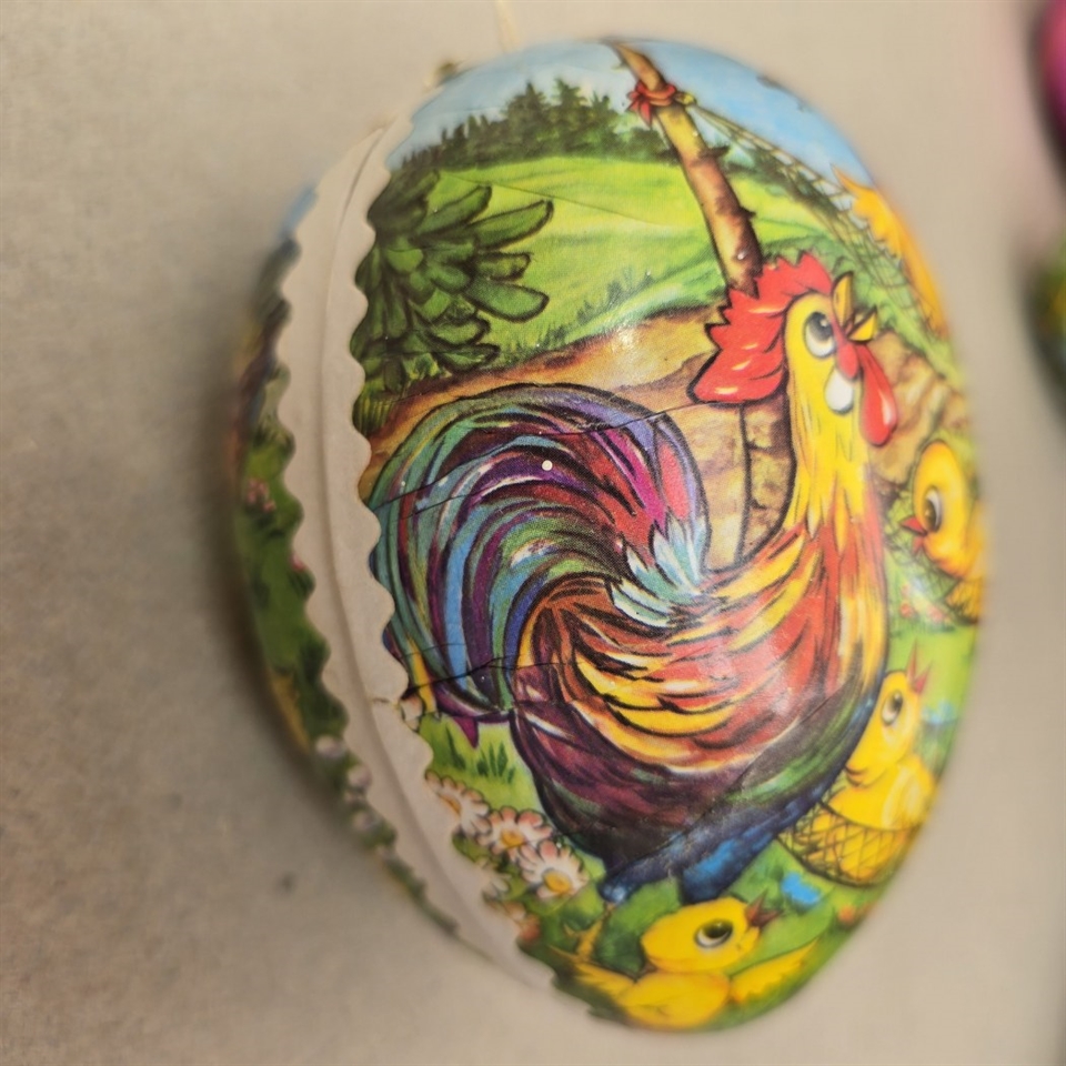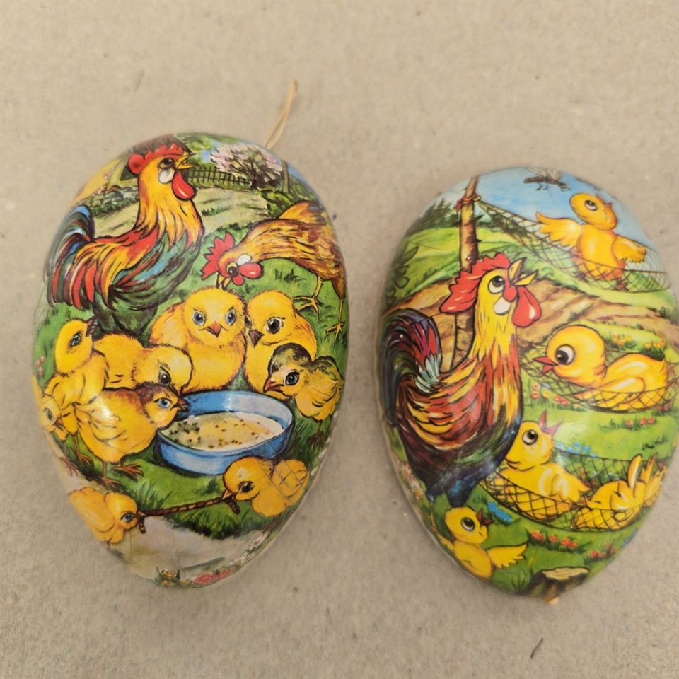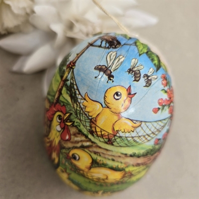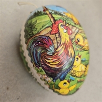 Vores dekorative påskeæg er fremstillet af gammeldags pap, der omhyggeligt er dekoreret med henførende motiver af kyllinger, hængekøjer og haner.