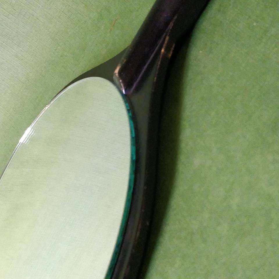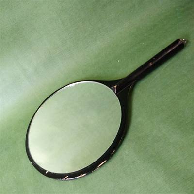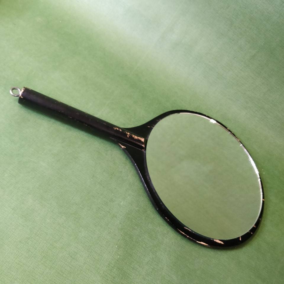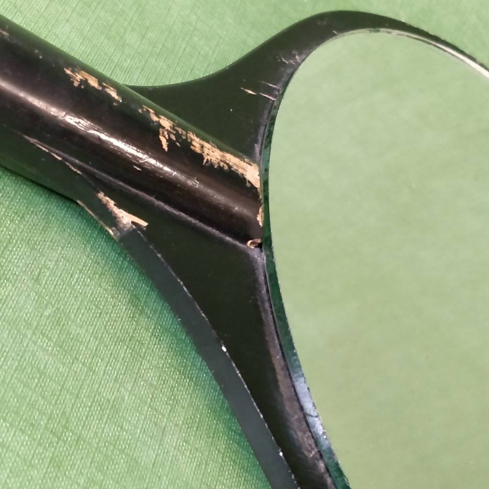 Gammelt håndspejl i sort træ med spejle på begge sider.