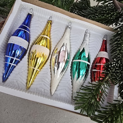 Opdag magien ved en traditionel jul med vores eksklusive sæt af dråbeformede gamle julekugler i glade farver, dekoreret med charmerende sukkerpynt.
