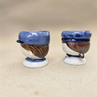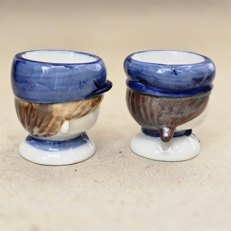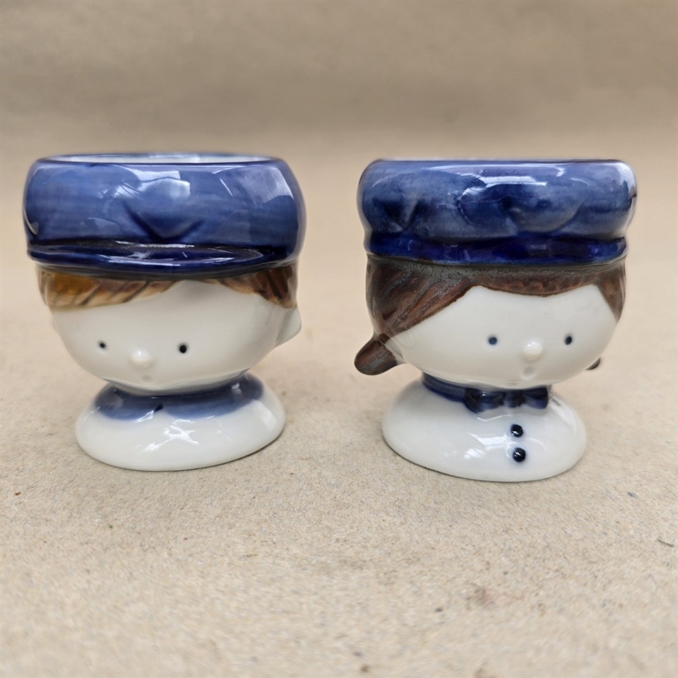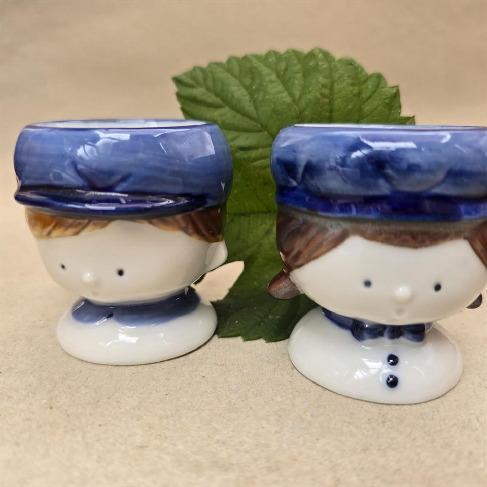 Hvert æggebæger er omhyggeligt udformet i porcelæn og forestiller en sød dreng og pige med brunt hår og blå hatte, der tilføjer et strejf af farve og glæde til dit bord.