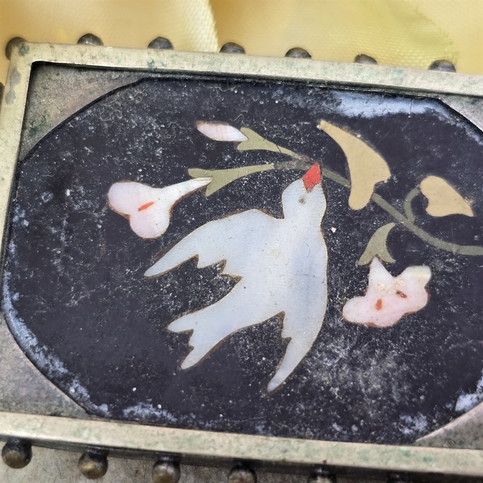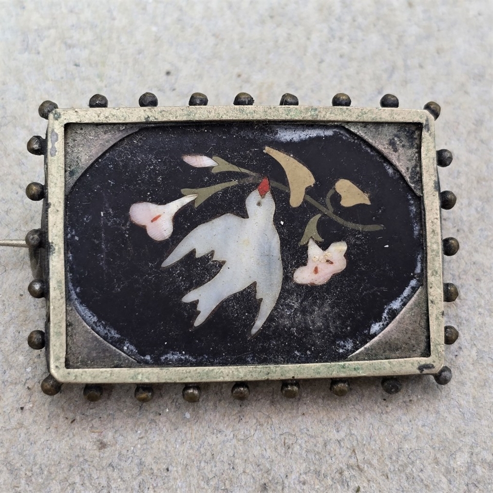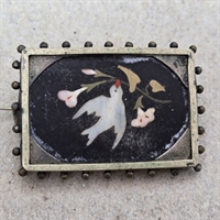 Oplev den uforlignelige elegance og tidløse charme med vores eksklusive 'Due med blomster, intarsia broche på sort bund'. Dette vintage smykke er en ægte skat, der tilfører et strejf af raffinement og aristokratisk finesse til enhver garderobe.