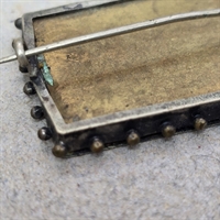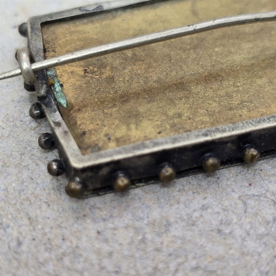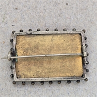 Kanten af brochen er prydet med sølvfarvede perler, der tilføjer et yderligere lag af sofistikation og glans. Den rektangulære form giver et moderne præg på et ellers klassisk stykke. Et alsidigt tilbehør, der kan bæres ved enhver lejlighed, fra formelle begivenheder til afslappede sammenkomster.