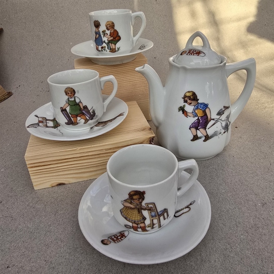 Dette yndige sæt er perfekt til at vække fantasien og skabe mindeværdige øjeblikke. Sættet indeholder en 13,5 cm. høj kaffekande og tre par matchende kopper, alle smukt dekoreret med livlige børnemotiver og søde dyredekorationer.