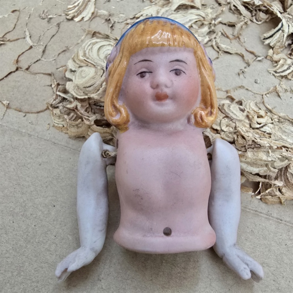 Dukkens gyldne lokker er omhyggeligt arrangeret, og det sirlige blå pandebånd tilføjer et strejf af farve og elegance, der fanger øjet. Denne lille figur er ikke kun et legetøj, men et stykke historie, der bringer en følelse af æraens charme og finesse til nutiden.
