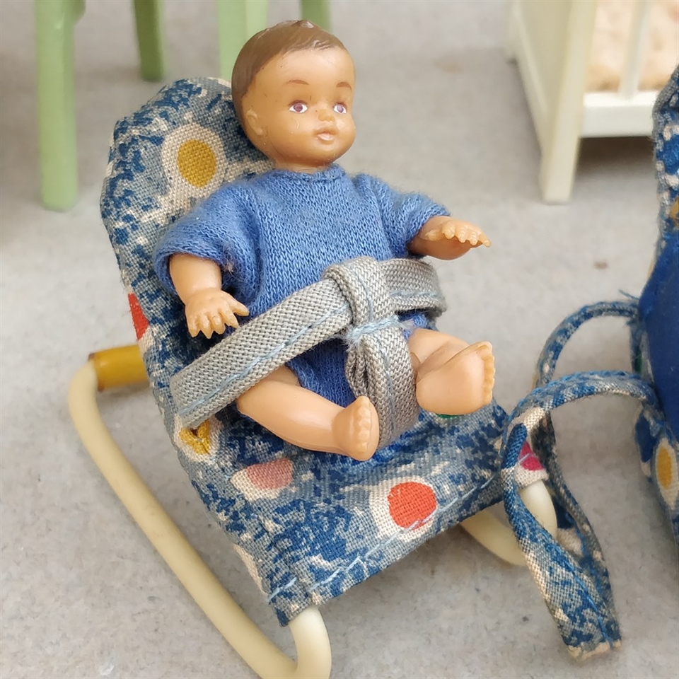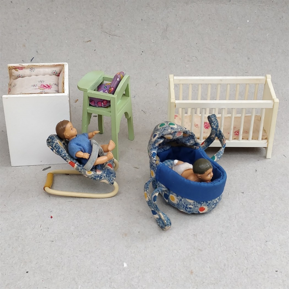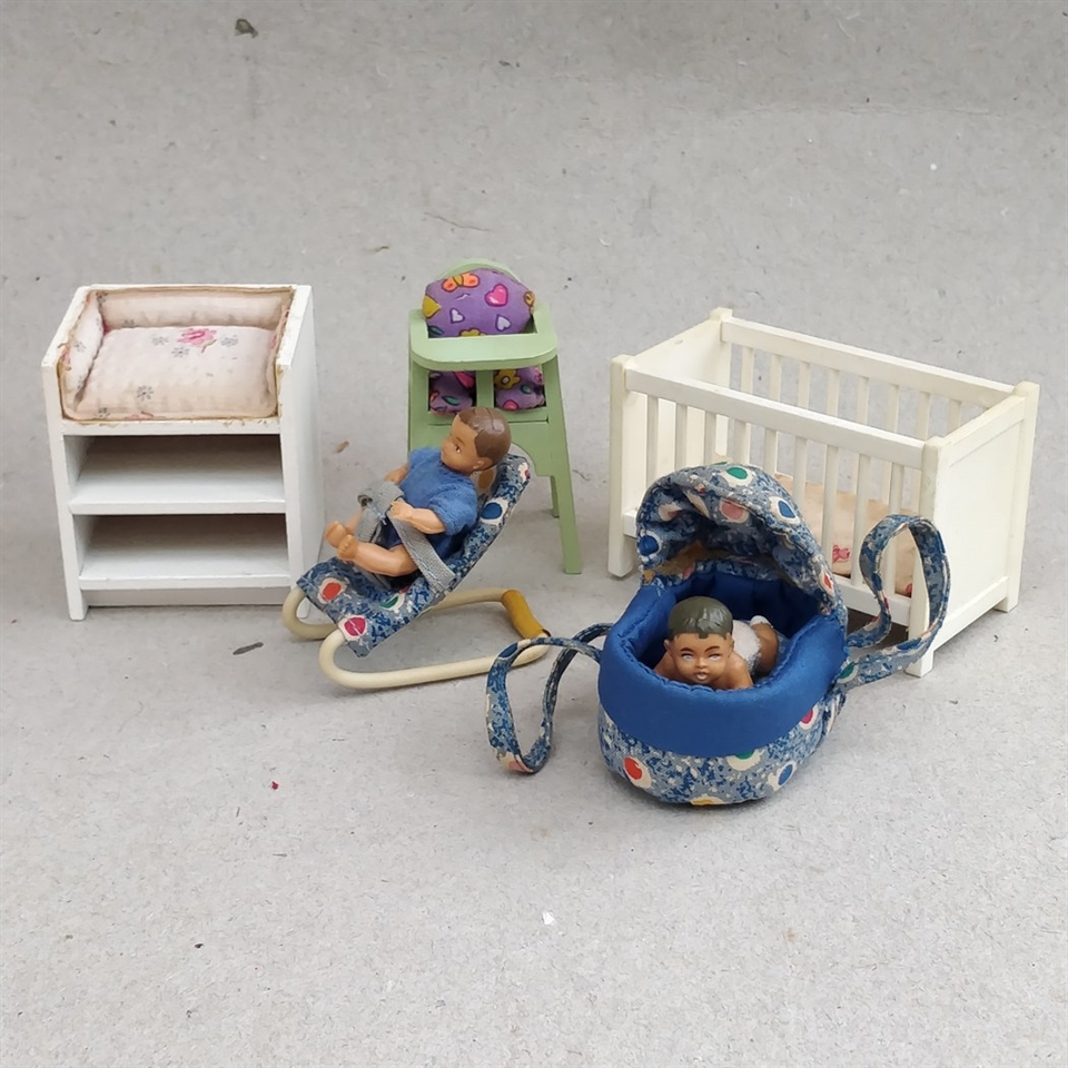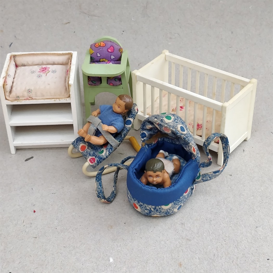 Opdag charmen ved fortiden med vores 'Dukkehus babyting' sæt, som er en nostalgisk samling af retro legetøj til dit dukkehus.