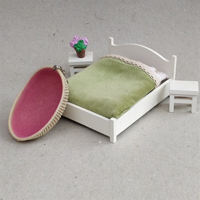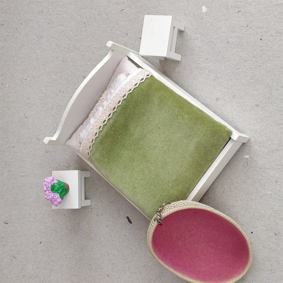 Giv dit dukkehus et stilfuldt og hyggeligt touch med vores "Dukkehus møbler, dobbeltseng, hængestol og sengeborde. 5 dele" sæt.