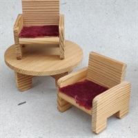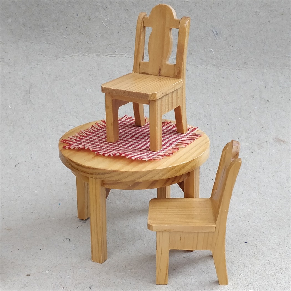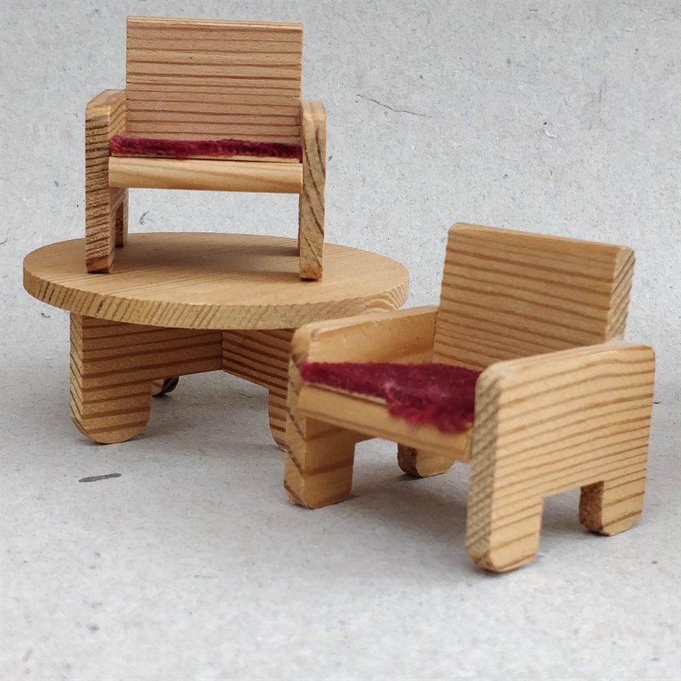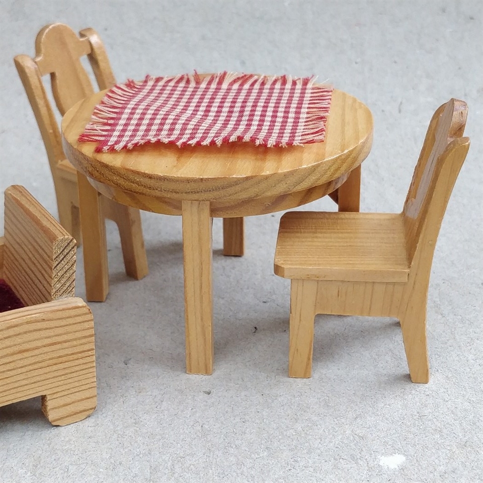 Giv dit dukkehus en charmerende opdatering med vores 'Dukkehus møbler spisebord og sofabord med lænestole i naturtræ'.