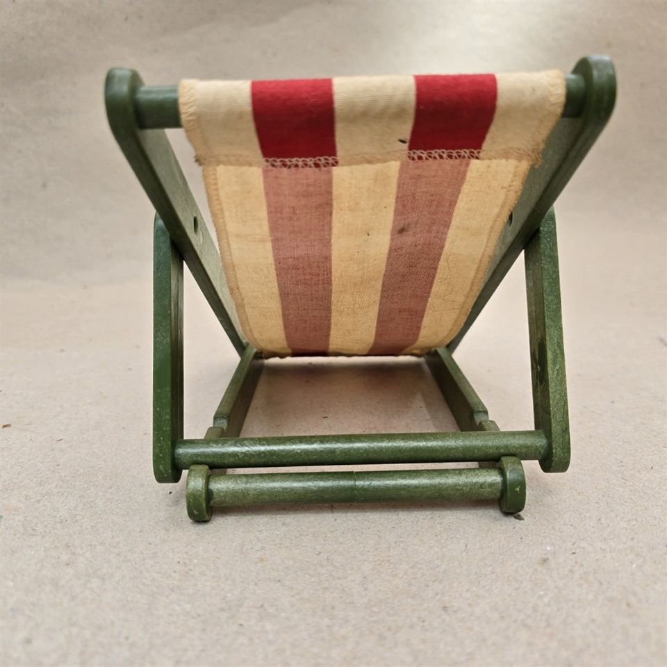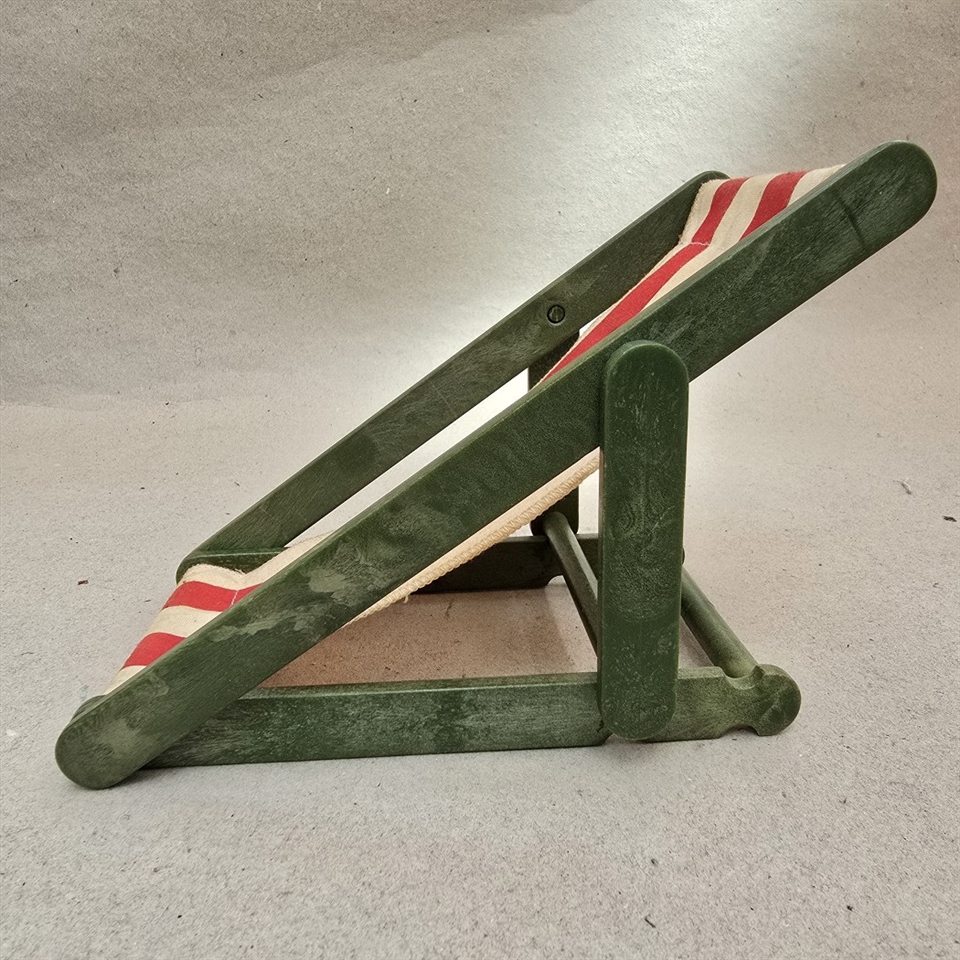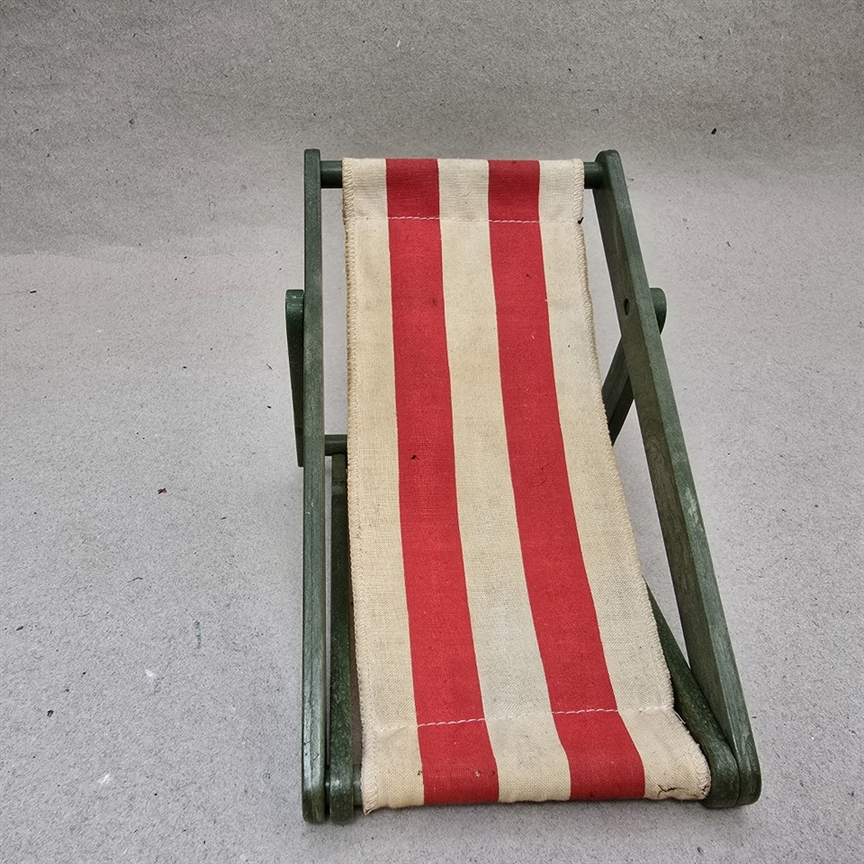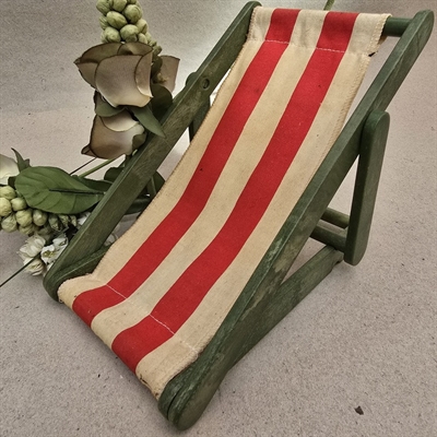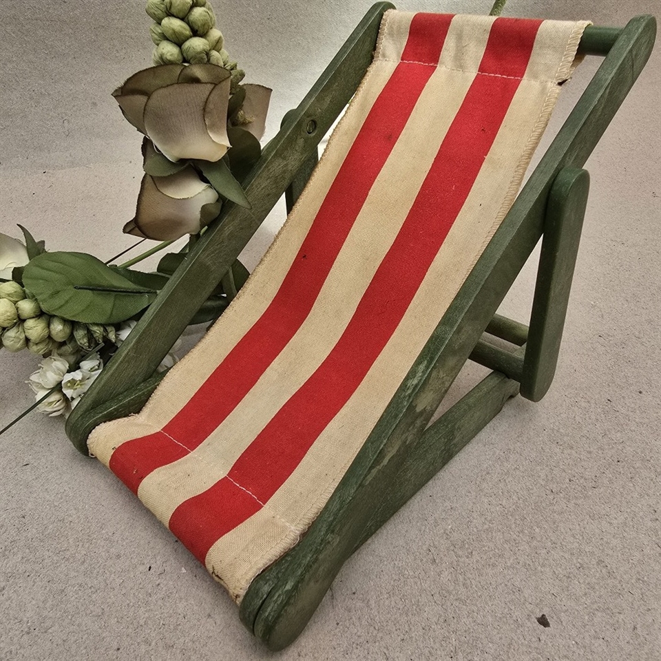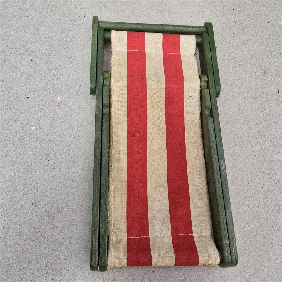 Oplev nostalgiens charme med vores 'Dukkeliggestol' - det perfekte tilbageblik til barndommens dage! Denne søde lille liggestol er designet specielt til dukker og byder på et friskt grønt træstel kombineret med et livligt hvidt og rødt stribet lærred, der tilfører et strejf af farverig sjov.