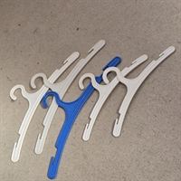 Dette sæt består af fem kærligt designede bøjler: fire i klassisk hvid og en i en charmerende blå farve, som tilføjer et sjovt og farverigt twist til dukkens klædeskab.